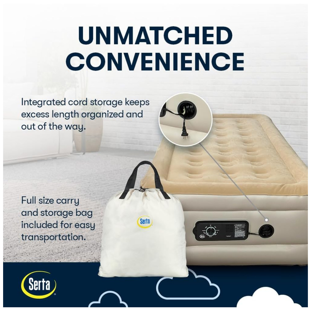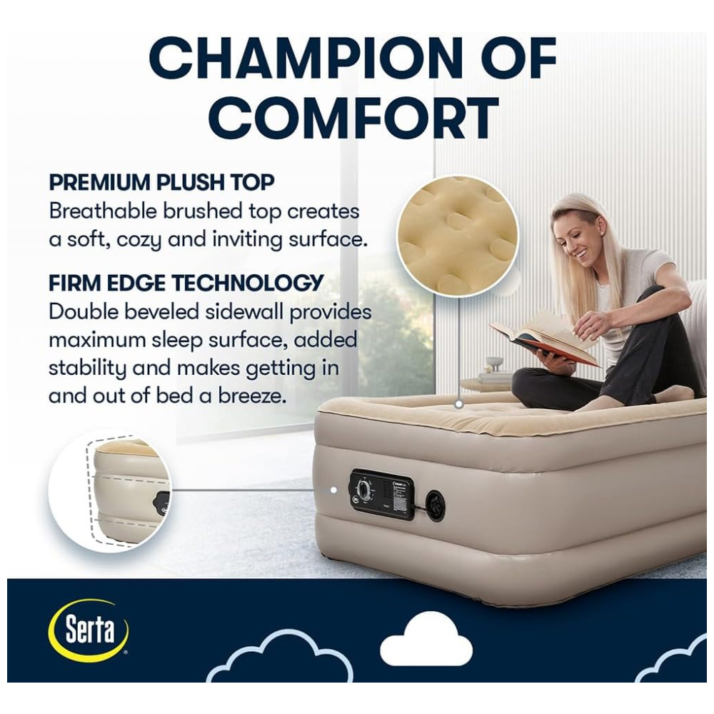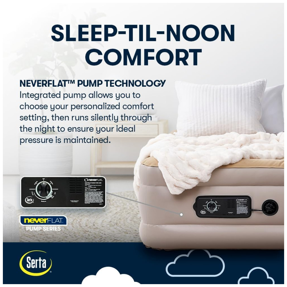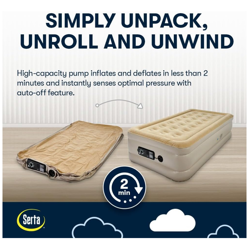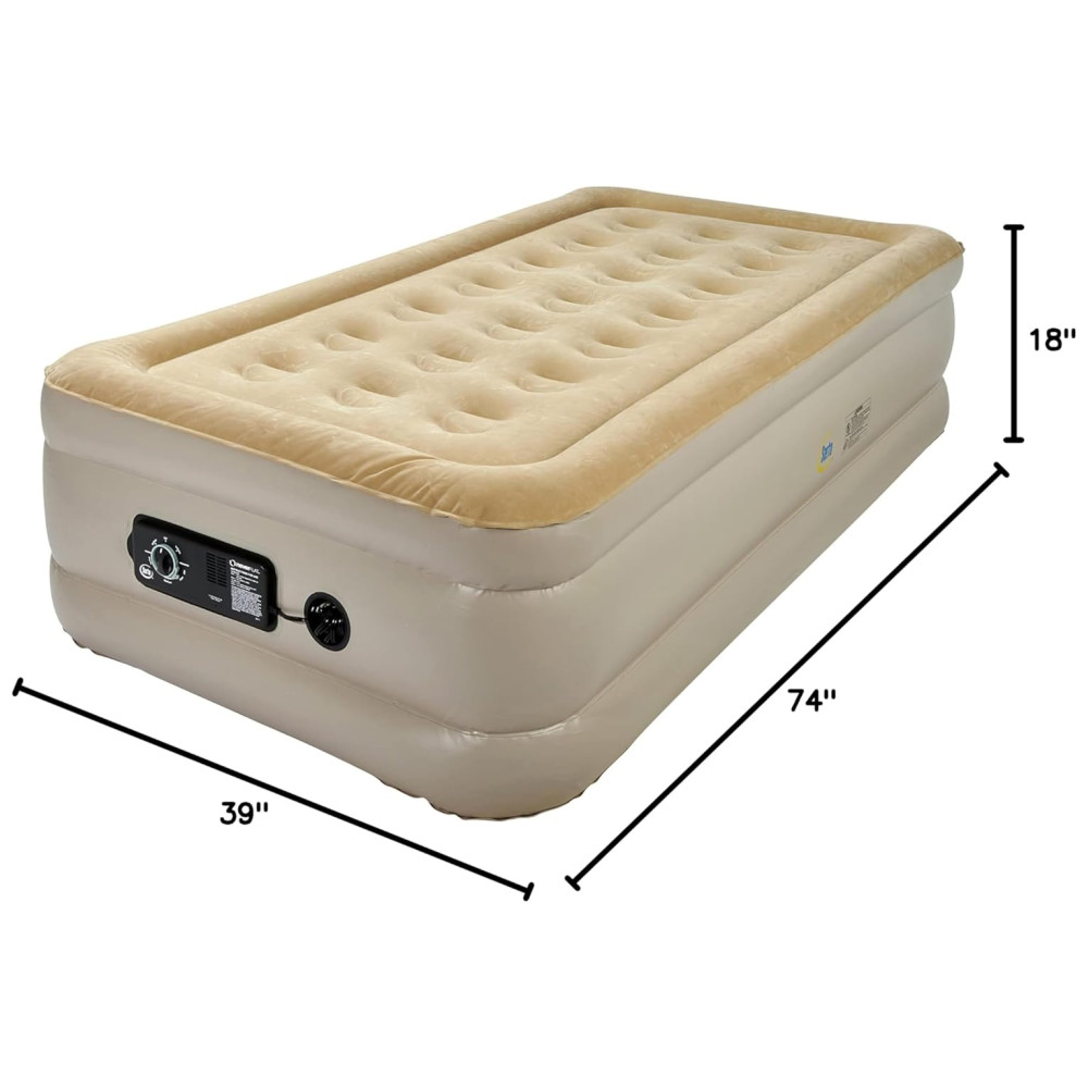 COLCHÃO DE AR GÊMEO PADRÃO A construção em PVC com parte superior flocada e 21 bobinas circulares neste colchão de ar de tamanho duplo cria uma superfície de sono forte, solidária e nivelada, independentemente de como você se move durante a noite. A altura elevada de 45cm facilita a entrada e saída da cama. BOMBAS INCORPORADAS Duas bombas embutidas em uma cama. O sistema patenteado de bomba NeverFLAT mantém silenciosamente o colchão de ar inflado a noite toda. Colchão de ar em menos de 4 minutos. O SECUNDARY NeverFLAT PUMP monitora e mantém silenciosamente a pressão do ar no nível de conforto desejado enquanto você dorme. O recurso conveniente de desligamento automático na bomba primária desliga automaticamente o sistema da bomba quando o colchão de ar estiver totalmente inflado , desinflado. CHAVES DE SUCESSO inflar o colchão de acordo com as instruções incluídas. Observe que o material pode esticar durante os primeiros usos. Recomenda se inflar a cama pelo menos 1 hora antes de usá la ou medi la. Pode ser necessário ar extra após esse período, para obter total firmeza.Com o sistema de bomba NeverFLAT, esse ar extra é adicionado automaticamente. O QUE ESTÁ INCLUÍDO 1x colchão de ar duplo com bombas embutidas, 1x ca bolsa de transporte para zenamento e viagem convenientes, 2x correções de reparo e 1x manual do usuário.