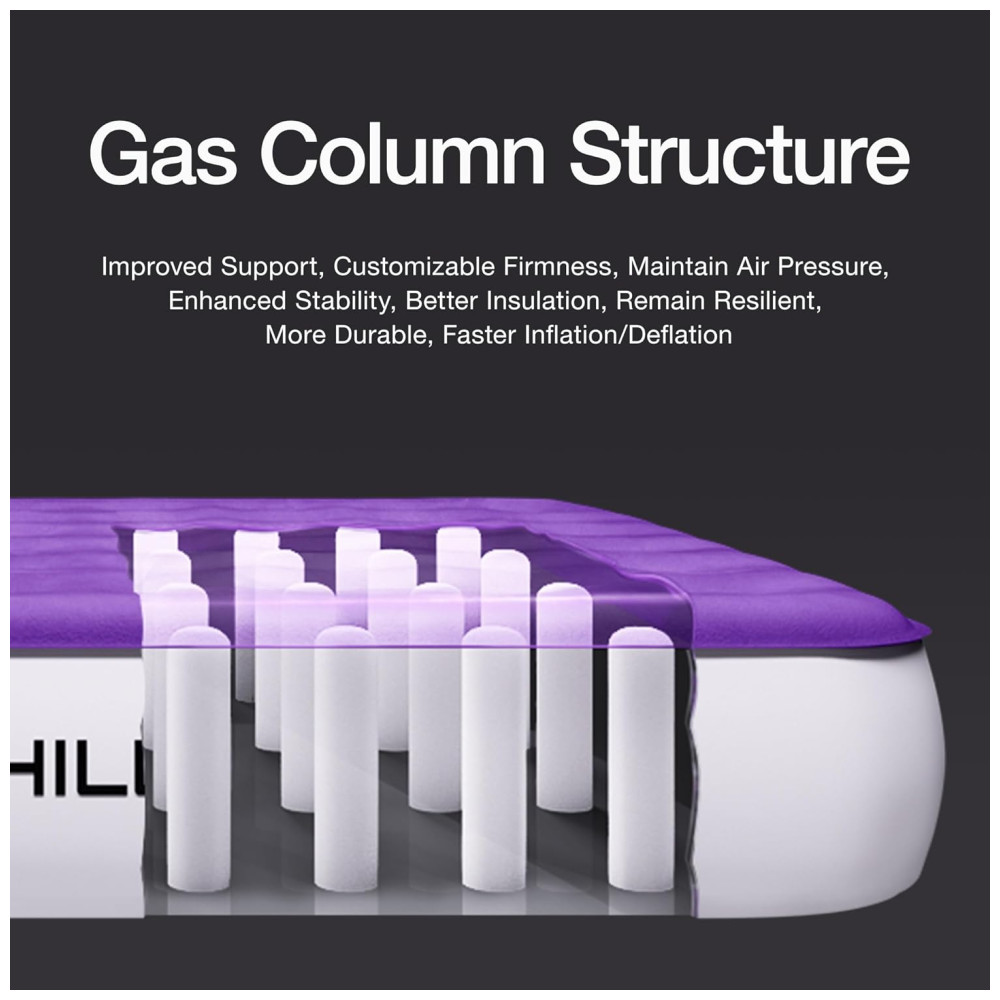 Estrutura única esta cama inflável consiste em vigas retas e 21 estruturas de bobinas de ar internas que podem ser muito melhoradas em durabilidade e suporte. Apresenta uma confortável camada superior flocada à prova dágua e PVC ecológico resistente a perfurações. Desfrute de descanso imediato.
