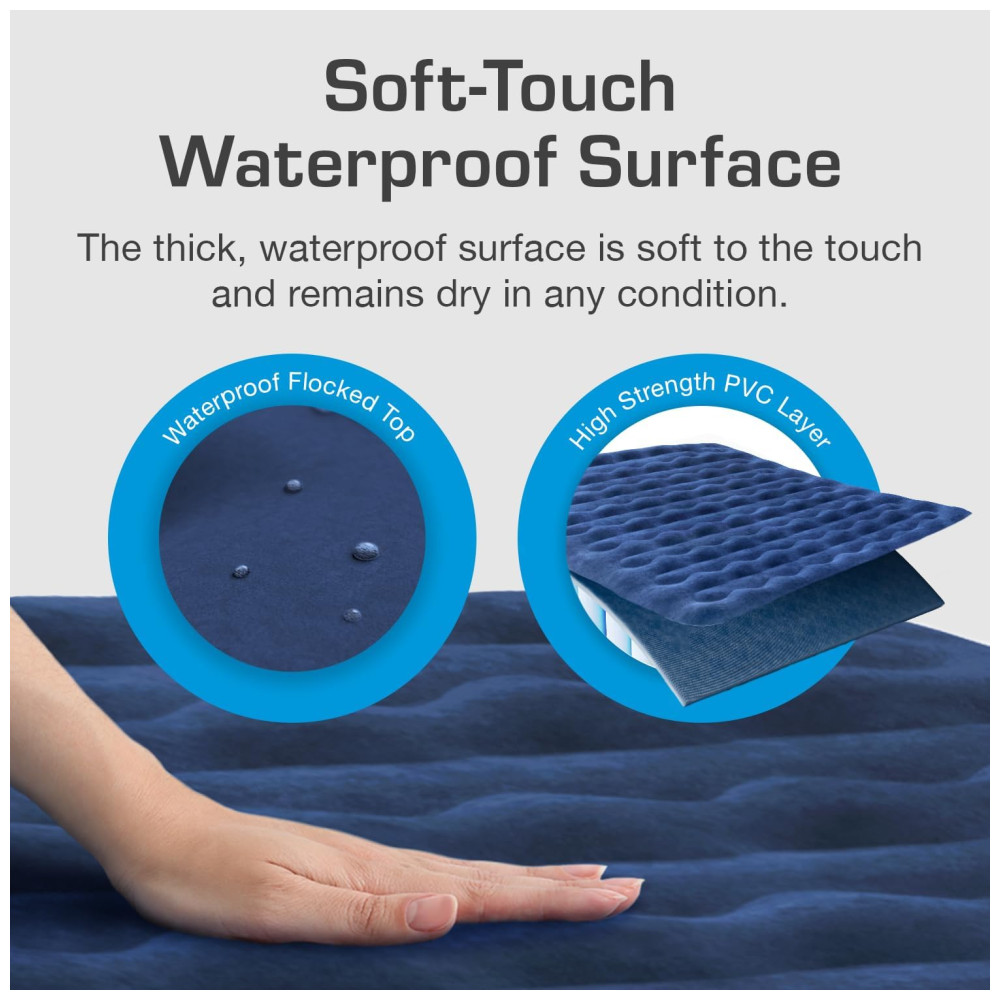 Material de alta qualidade e fácil de manter o leito de ar é revestido com um floco impermeável e que não agride a pele e um material de PVC extra espesso e resistente a perfurações na parte inferior. Um travesseiro levantado ergonomicamente projetado oferece conforto semelhante a uma cama para uma ótima noite de sono. Também é fácil de limpar, basta usar água com sabão ou um pano para limpar a superfície do colchão inflável.