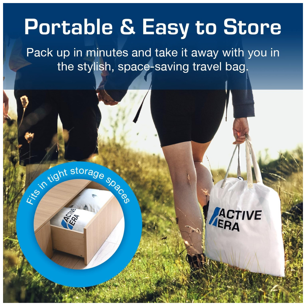 Fácil zenamento e garantia o colchão de ar duplo Active Era vem com uma bolsa de transporte. Simplesmente dobre, enrole e guarde o colchão de ar vazio na bolsa