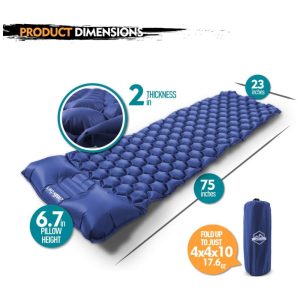 Impermeável e durável. Feito para durar, superfície confortável, silenciosa, antiderrapante e impermeável. O design hexagonal ajuda a definir a almofada com firmeza, sem se mover Material 70D Ripstop Nylon Inflação. ZOOOBELIVES Almofada de dormir ultraleve com almofada incorporada Este tapete de campismo é super pequeno e leve para o seu pacote. E fácil de inflar e desinflar para colocar de volta no saco. É ideal para camping, caminhadas, montanhismo, mochila, viagens e outras atividades ao ar livre, também é bom para uso doméstico, almoço no escritório, etc. Tapete e travesseiro 2 em 1 design, mais conveniente e confortável O design de câmaras separadas facilita o ajuste o volume de ar da parte do travesseiro e da parte do travesseiro. Não ocupa quase nenhum espaço na sua mala após a deflação, mas abre grande e confortável. Fácil inflação e deflação em apenas 10 a 15 respirações, fácil de enrolar, arrumar. Design de câmaras separadas ultraleves e compactas. Confortável e relaxante Mantenha você longe do chão e sem pressão no pescoço e nas costas, mesmo depois de uma noite inteira dormindo. É ideal para camping, caminhadas, montanhismo, mochila, viagens e outras atividades ao ar livre, também é bom para uso doméstico, almoço no escritório, etc