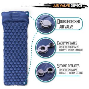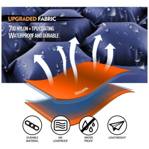 Design Projeto das câmaras de duelo. As câmaras de ar do tapete de dormir e do travesseiro são independentes um do outro, para impedir que o ar seja pressionado no travesseiro quando você estiver deitado. E permite ajustar o volume do ar para obter o melhor conforto, ou nenhuma inflação necessária para o travesseiro, caso não se destine a usá lo. Confortável e relaxante. O design hexagonal de suporte de ar para limitar o movimento do ar e a perda de calor. Ele se encaixa perfeitamente nas curvas naturais do corpo e ajuda a deixar o pad mais estável sem se mover, mantê lo fora do chão e sem pressão no pescoço e nas costas, mesmo depois de uma noite inteira dormindo. Ultraleve e durável. Este tapete de dormir para acampamento ao ar livre é feito de tecido de nylon Ripstop 70D ultraleve premium e laminação extrudada em TPU. Esta almofada de dormir oferece um equipamento de acampamento durável, sem preocupações com galhos ou pedras afiadas. Pesa apenas 1,1 kg, facilitando o transporte e perfeito para sua barraca e rede. Fácil de usar. Este tapete de acampamento é super fácil de inflar e desinflar. Basta abrir a parte superior da válvula de ar de dois andares e soprar ar nela, apenas 10 a 15 respirações e abra a 2a válvula para esvaziar apenas em segundos. É super compacto e completamente plano quando esvaziado, o que não ocupa muito espaço quando você o enrola, facilitando o transporte e o zenamento na mochila ou na mala de viagem.