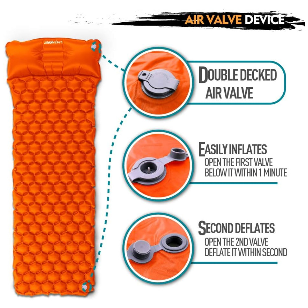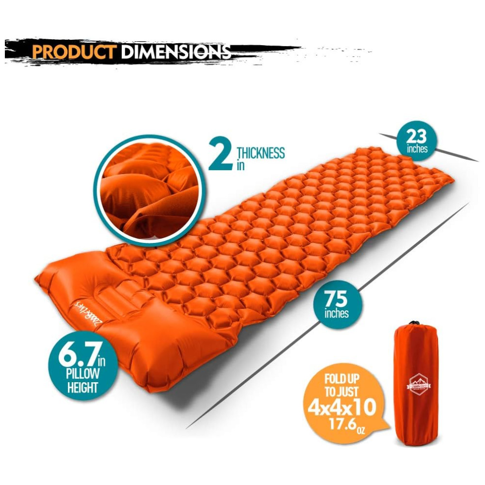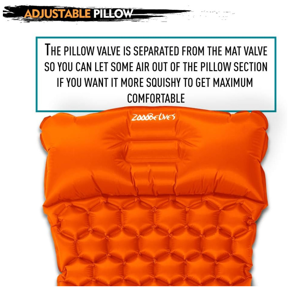 Impermeável e durável. Feito para durar, superfície confortável, silenciosa, antiderrapante e impermeável. O design hexagonal ajuda a definir a almofada com firmeza, sem se mover Material 70D Ripstop Nylon Inflação. ZOOOBELIVES Almofada de dormir ultraleve com almofada incorporada Este tapete de campismo é super pequeno e leve para o seu pacote. E fácil de inflar e desinflar para colocar de volta no saco. É ideal para camping, caminhadas, montanhismo, mochila, viagens e outras atividades ao ar livre, também é bom para uso doméstico, almoço no escritório, etc. Tapete e travesseiro 2 em 1 design, mais conveniente e confortável O design de câmaras separadas facilita o ajuste o volume de ar da parte do travesseiro e da parte do travesseiro. Não ocupa quase nenhum espaço na sua mala após a deflação, mas abre grande e confortável. Fácil inflação e deflação em apenas 10 a 15 respirações, fácil de enrolar, arrumar. Design de câmaras separadas ultraleves e compactas. Confortável e relaxante Mantenha você longe do chão e sem pressão no pescoço e nas costas, mesmo depois de uma noite inteira dormindo. É ideal para camping, caminhadas, montanhismo, mochila, viagens e outras atividades ao ar livre, também é bom para uso doméstico, almoço no escritório, etc