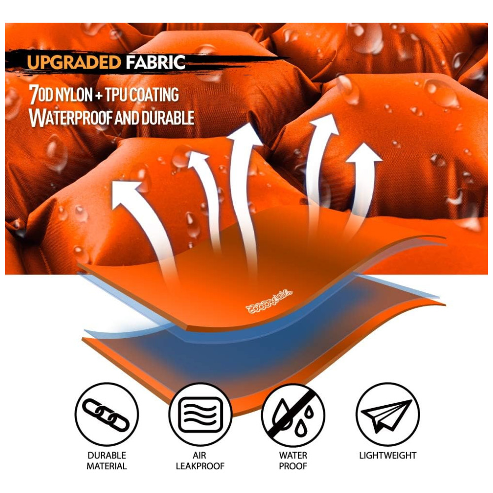 Design Projeto das câmaras de duelo. As câmaras de ar do tapete de dormir e do travesseiro são independentes um do outro, para impedir que o ar seja pressionado no travesseiro quando você estiver deitado. E permite ajustar o volume do ar para obter o melhor conforto, ou nenhuma inflação necessária para o travesseiro, caso não se destine a usá lo. Confortável e relaxante. O design hexagonal de suporte de ar para limitar o movimento do ar e a perda de calor. Ele se encaixa perfeitamente nas curvas naturais do corpo e ajuda a deixar o pad mais estável sem se mover, mantê lo fora do chão e sem pressão no pescoço e nas costas, mesmo depois de uma noite inteira dormindo. Ultraleve e durável. Este tapete de dormir para acampamento ao ar livre é feito de tecido de nylon Ripstop 70D ultraleve premium e laminação extrudada em TPU. Esta almofada de dormir oferece um equipamento de acampamento durável, sem preocupações com galhos ou pedras afiadas. Pesa apenas 1,1 kg, facilitando o transporte e perfeito para sua barraca e rede. Fácil de usar. Este tapete de acampamento é super fácil de inflar e desinflar. Basta abrir a parte superior da válvula de ar de dois andares e soprar ar nela, apenas 10 a 15 respirações e abra a 2a válvula para esvaziar apenas em segundos. É super compacto e completamente plano quando esvaziado, o que não ocupa muito espaço quando você o enrola, facilitando o transporte e o zenamento na mochila ou na mala de viagem.