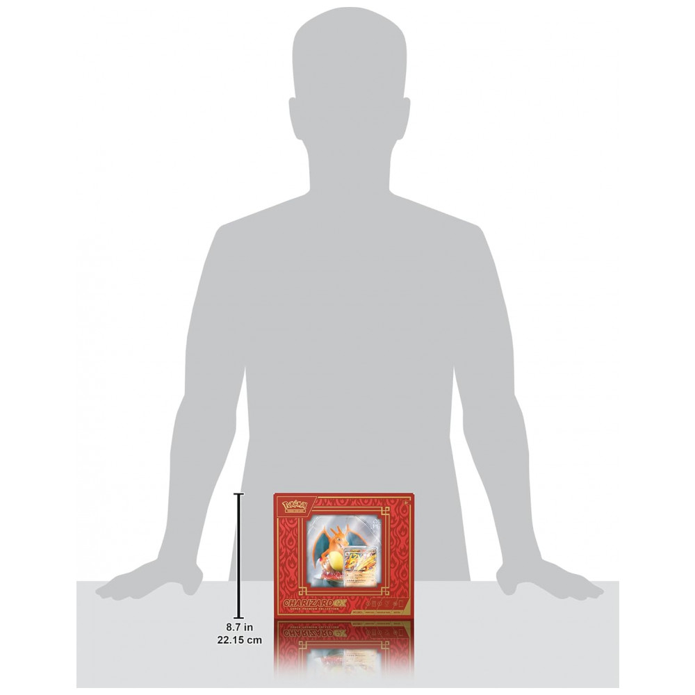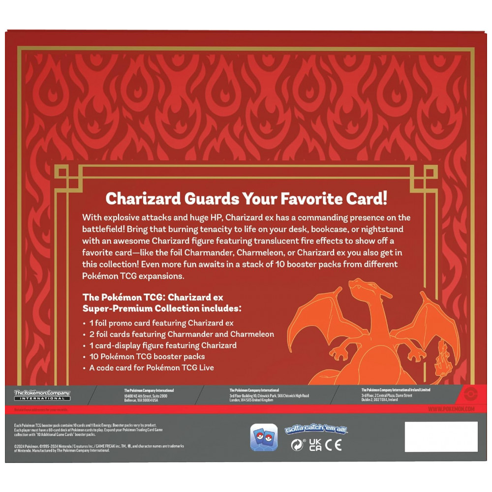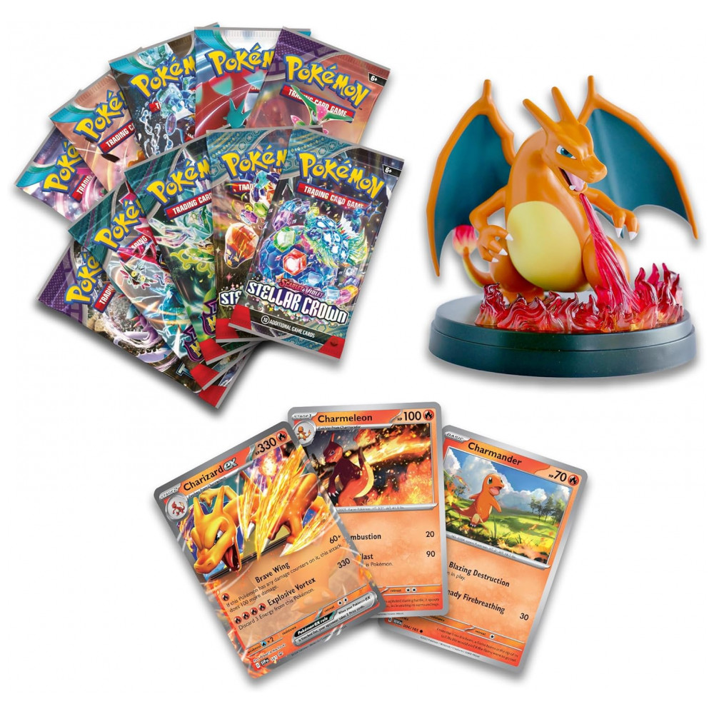 Conteúdo da embalagem: 10 boosters Pokémon TCG, 1 carta promocional foil Charizard ex, 2 cartas foil (Charmander e Charmeleon), 1 miniatura expositora de Charizard, 1 código para Pokémon TCG Live