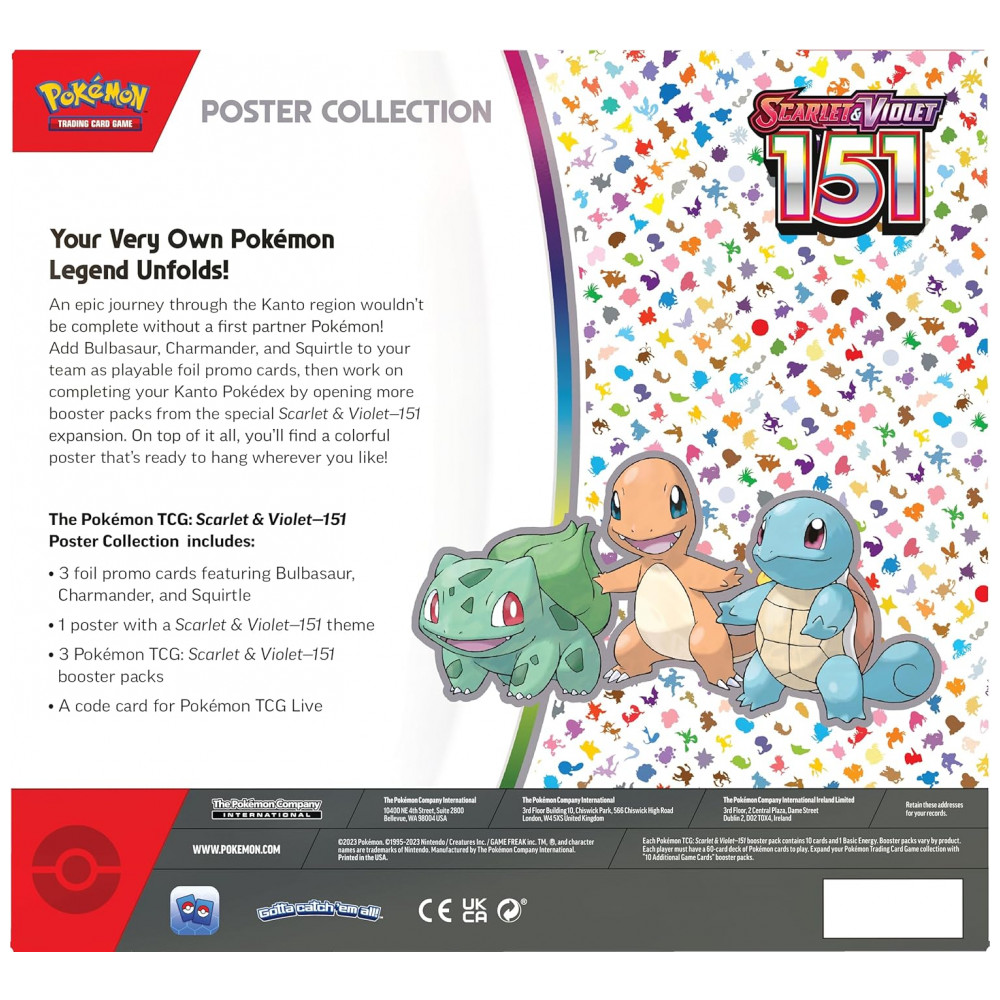 A Pokémon TCG Scarlet & Violet 151 Poster Collection é um conjunto da expansão especial Scarlet & Violet – 151 voltado à região de Kanto, combinando cartas promocionais, boosters e pôster temático em um único produto. O conjunto inclui três cartas promocionais foil jogáveis dos Pokémon iniciais de Kanto (Bulbasaur, Charmander e Squirtle), permitindo adicioná-los diretamente a baralhos compatíveis com o formato da coleção Scarlet & Violet.