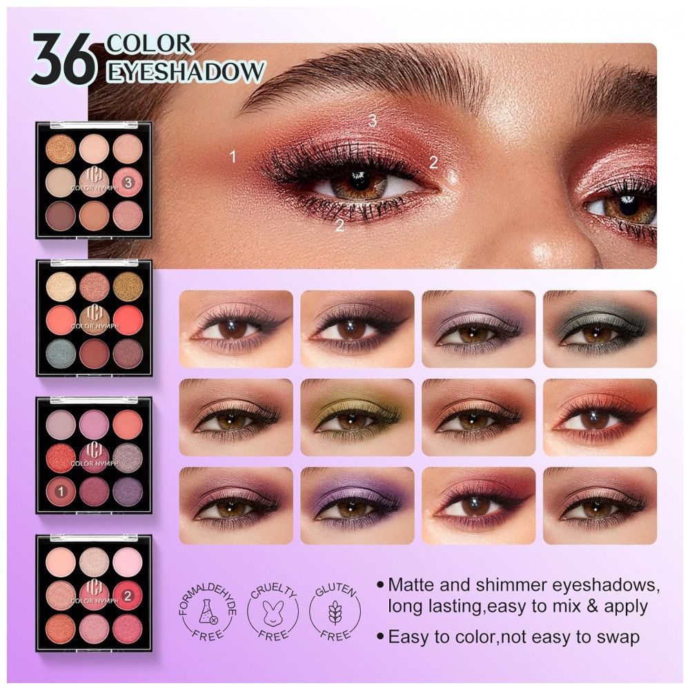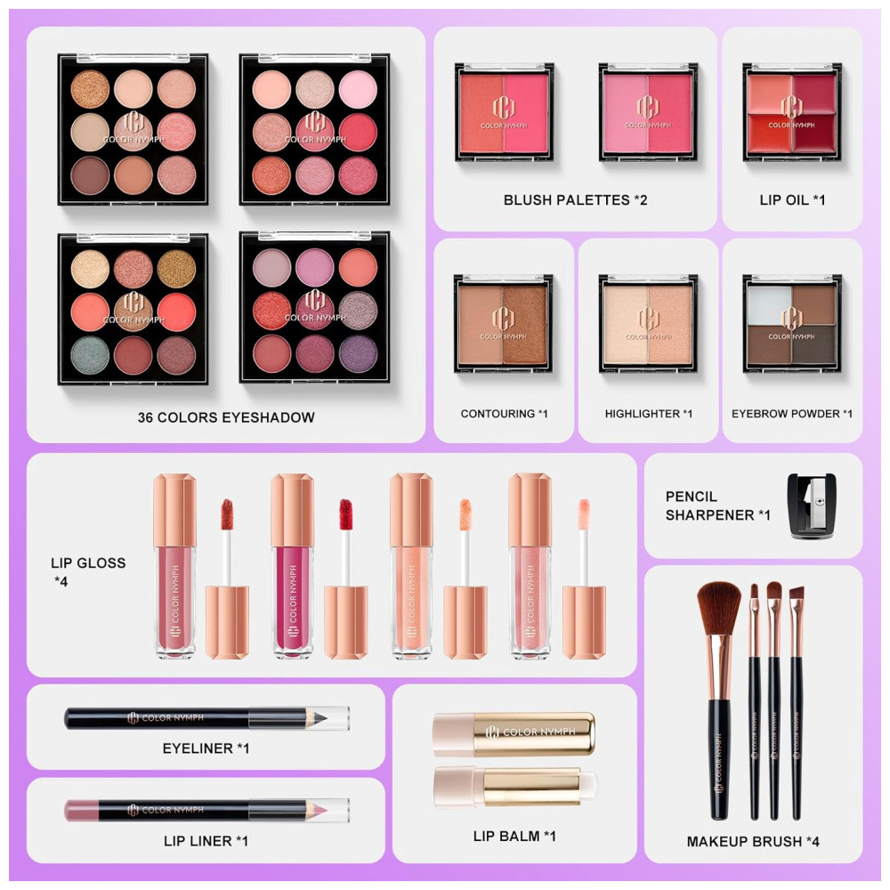 Kit Completo de Maquiagem All-in-One: Este kit feminino inclui 36 cores de sombra opaca e perolada, 4 tonalidades de óleo para lábios, 4 pós para sobrancelha, 4 paletas de blush, 2 iluminadores, 2 pós para contorno, 4 gloss para lábios, 1 balm labial, 1 lápis delineador labial, 1 lápis delineador de olhos e 4 pincéis de maquiagem, atendendo a todas as suas necessidades para criar um visual impecável. Visual Vibrante e Diversificado: Com fórmulas de longa duração, alta pigmentação e excelente capacidade de mistura, o conjunto realça seus traços naturais e pode ser intensificado para um efeito ousado e dramático, adequado para todos os tons de pele. Seja Mistério, Liberdade e Feminilidade: O design do kit inspira você a ser uma garota sem rótulos, abraçando o mistério e quebrando barreiras enquanto vive a vida com paixão. Acrescente um toque de brilho e irradie confiança em qualquer ambiente com esta maquiagem. Alta Qualidade com Preço Acessível: Os cosméticos para iniciantes são hipoalergênicos e livres de parabenos, seguros para uso nos olhos, lábios e rosto sem causar irritação. A qualidade é priorizada com rigorosos testes para proporcionar a melhor experiência em maquiagem. Elegante Maleta Portátil para Maquiagem: Com design compacto, é ideal para viagens, negócios e retoques rápidos durante o dia. Um presente perfeito para adolescentes, esposas, namoradas, mães e filhas que desejam praticidade e estilo.