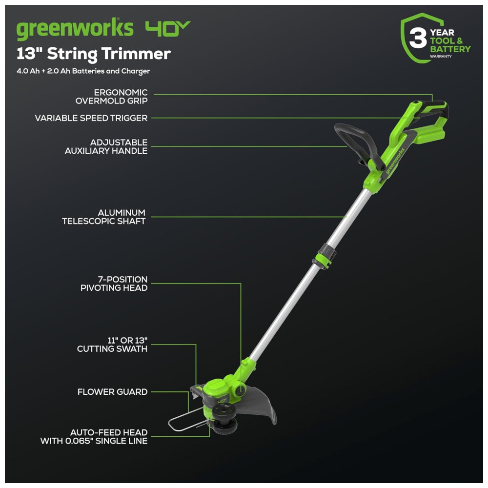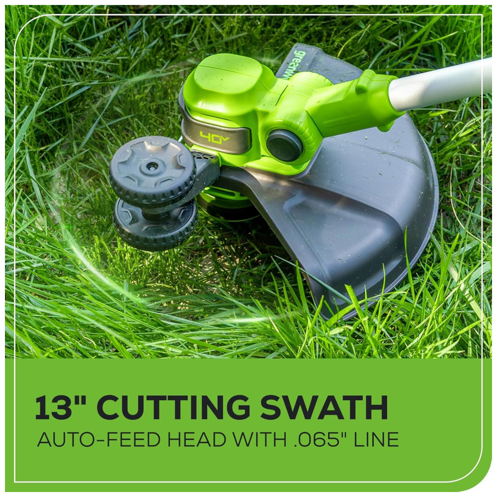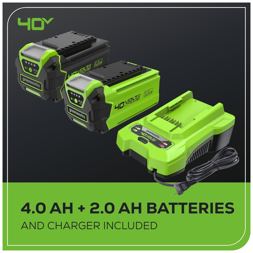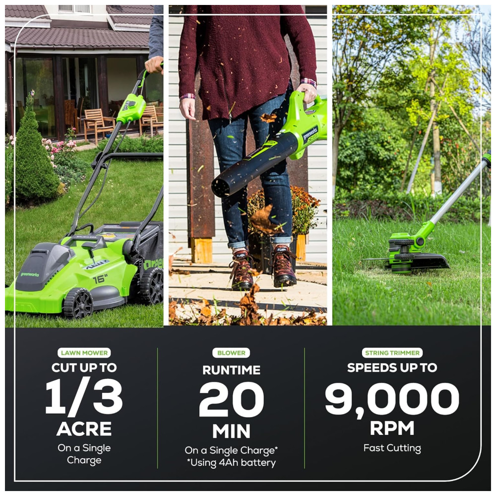 Combo Greenworks 40V: Cortador de Grama Sem Fio Soprador de Folhas e Aparador de Grama com Bateria 4.0Ah e 2.0Ah – Kit Completo