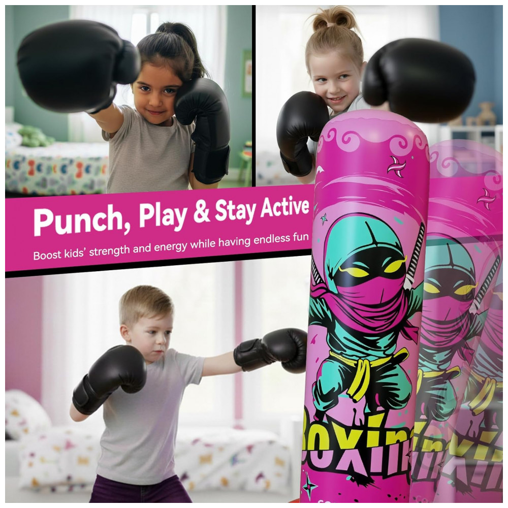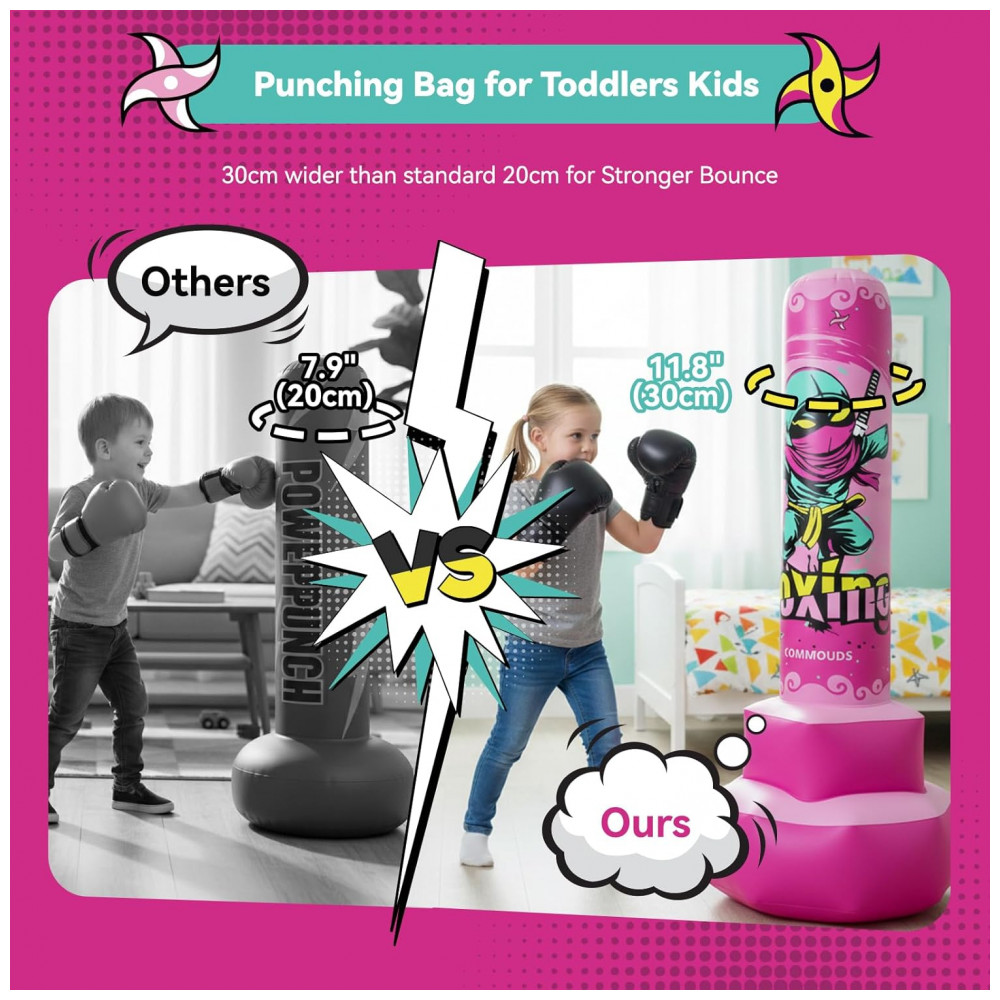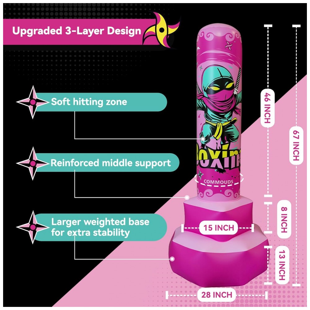 Saco de pancadas infantil inflável COMMOUDS na cor rosa, indicado para kickboxing e treinos recreativos de crianças e adolescentes na faixa etária infantil. Produzido em PVC, oferece superfície macia adequada para socos e chutes em atividades físicas em casa ou em áreas de lazer.