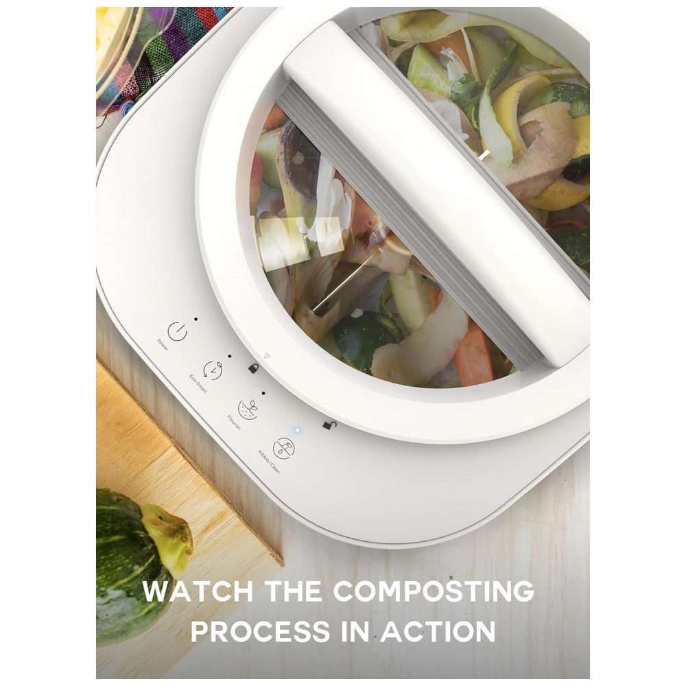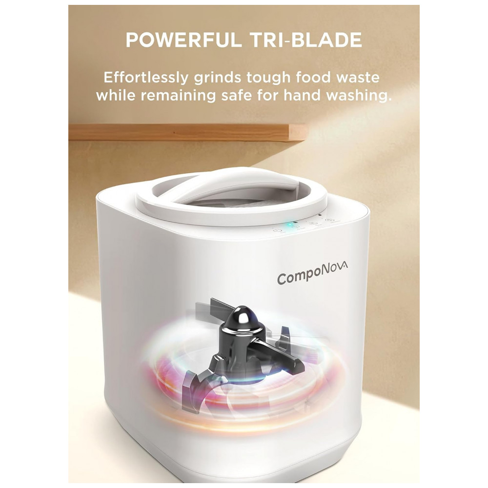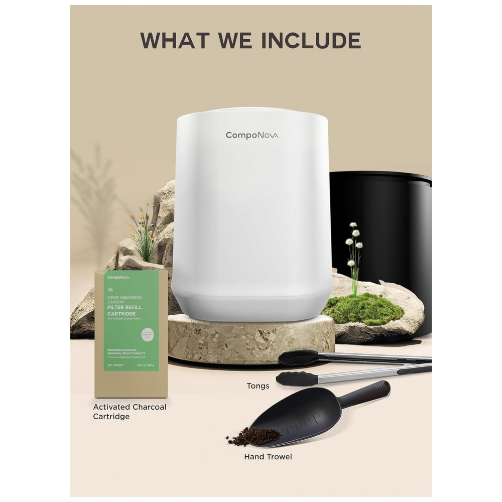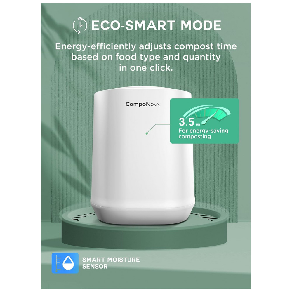 O compostor elétrico COMPONOVA de 4L processa resíduos de cozinha em pré-composto para plantas via moinho inteligente, desidratação e trituração em ciclos controlados por sensor, adequado para uso indoor em bancada doméstica. Sistema sem odores utiliza filtros de carbono e vedação hermética, transformando sobras orgânicas em fertilizante seco utilizável em até 24 horas. Indicado para rotinas residenciais com geração moderada de resíduos alimentares.