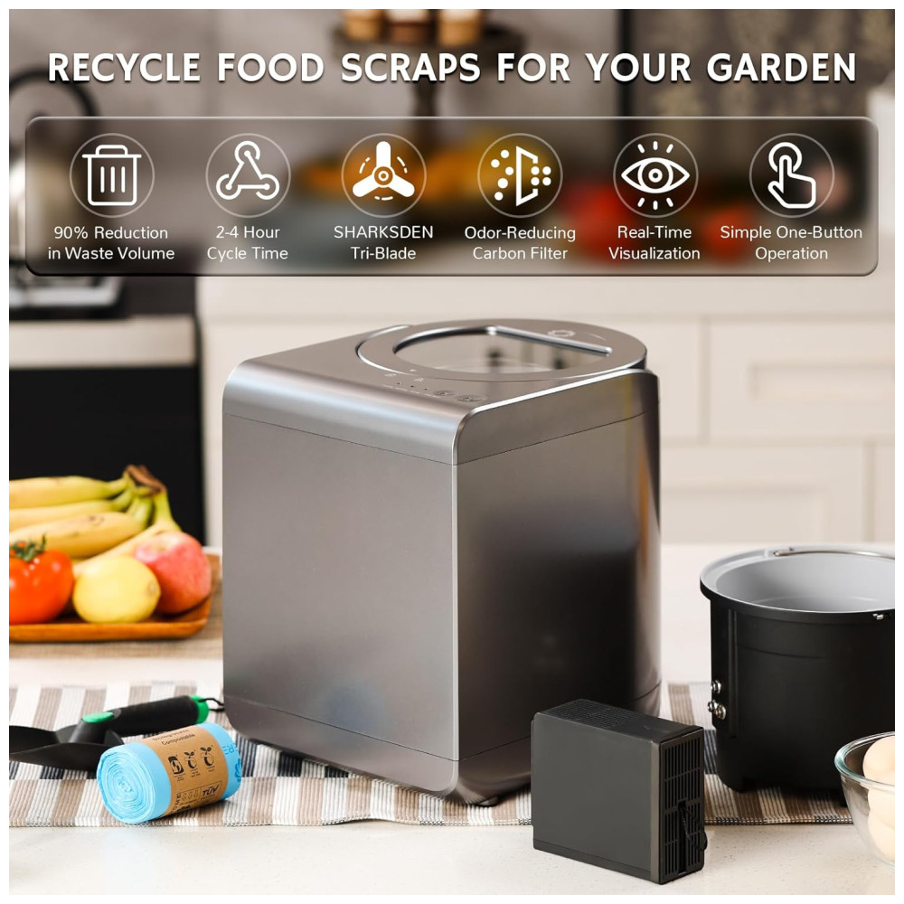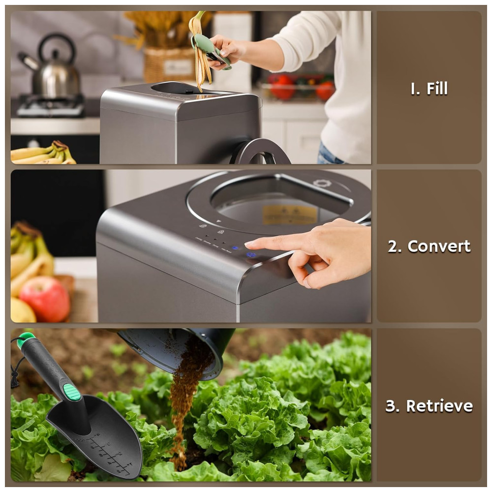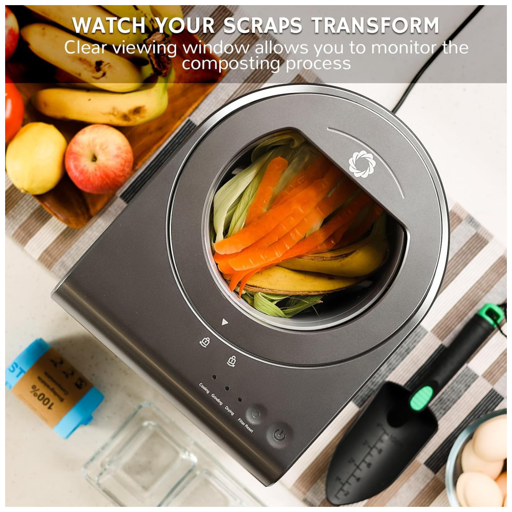 Transforme restos de comida e resíduos de cozinha em pó com nossa máquina de compostagem elétrica. Reduza o desperdício de alimentos em até 90%! O pó resultante pode ser utilizado como fertilizante para suas plantas ou descartado, ajudando a diminuir o volume e o odor do lixo.