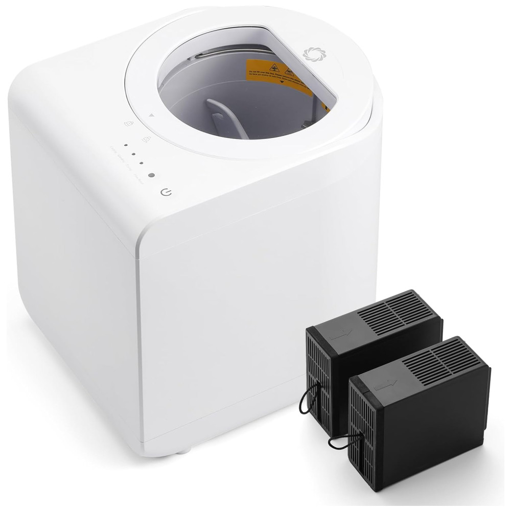 Utilizamos filtros de carvão ativado biodegradável, que reduzem a maioria dos odores sem causar danos ao meio ambiente. A máquina é fácil de usar e limpar, com operação de um botão e um balde de alumínio fundido que pode ser lavado na máquina de lavar louça.