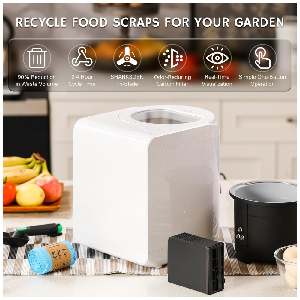 Composteira Elétrica de Cozinha 25L com Lâmina Tripla SHARKSDEN® e Tampa de Vidro Visual 110V Airthereal Branca