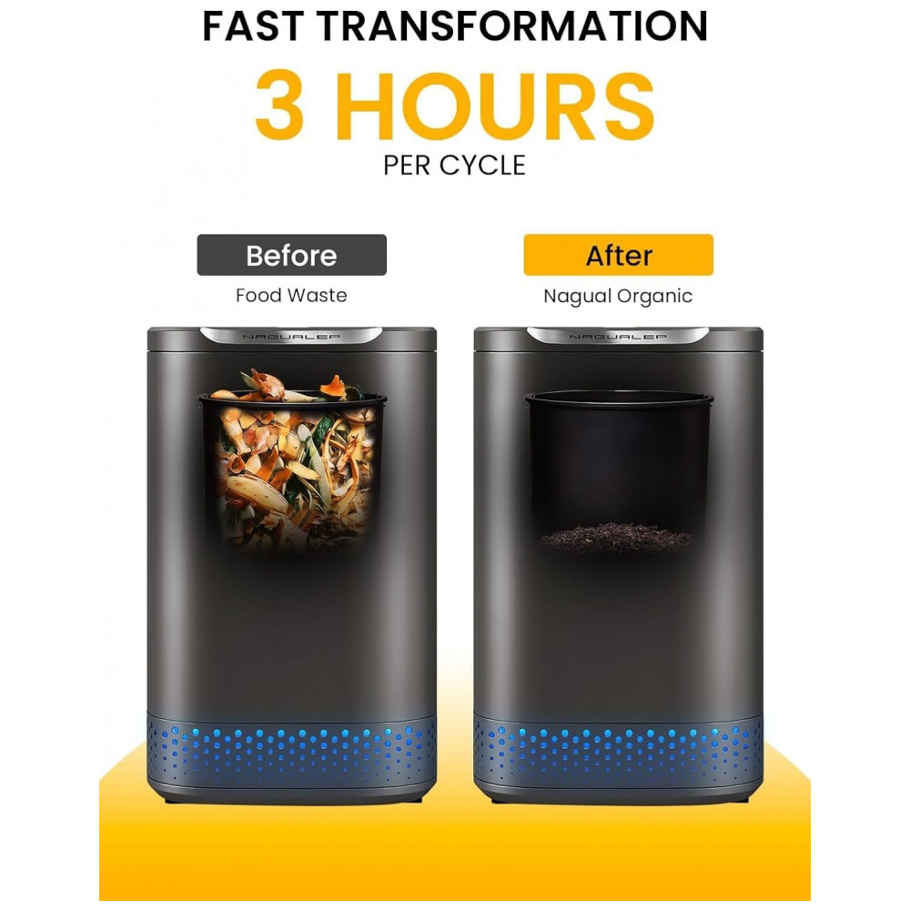 O compostor elétrico Nagual é uma solução ecológica e eficiente para reduzir o desperdício de alimentos em até 90%. Ao transformar resíduos de comida em fertilizante para plantas, ele contribui para a diminuição da pegada de carbono.
