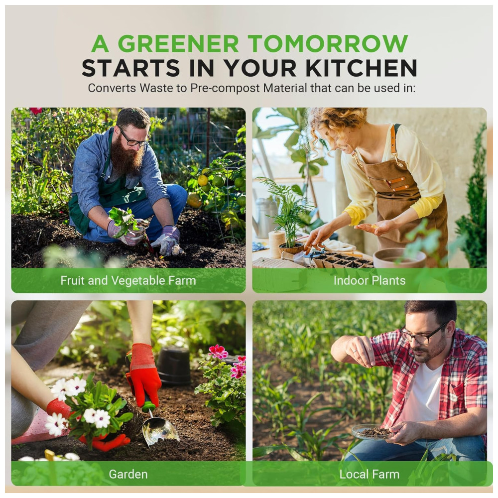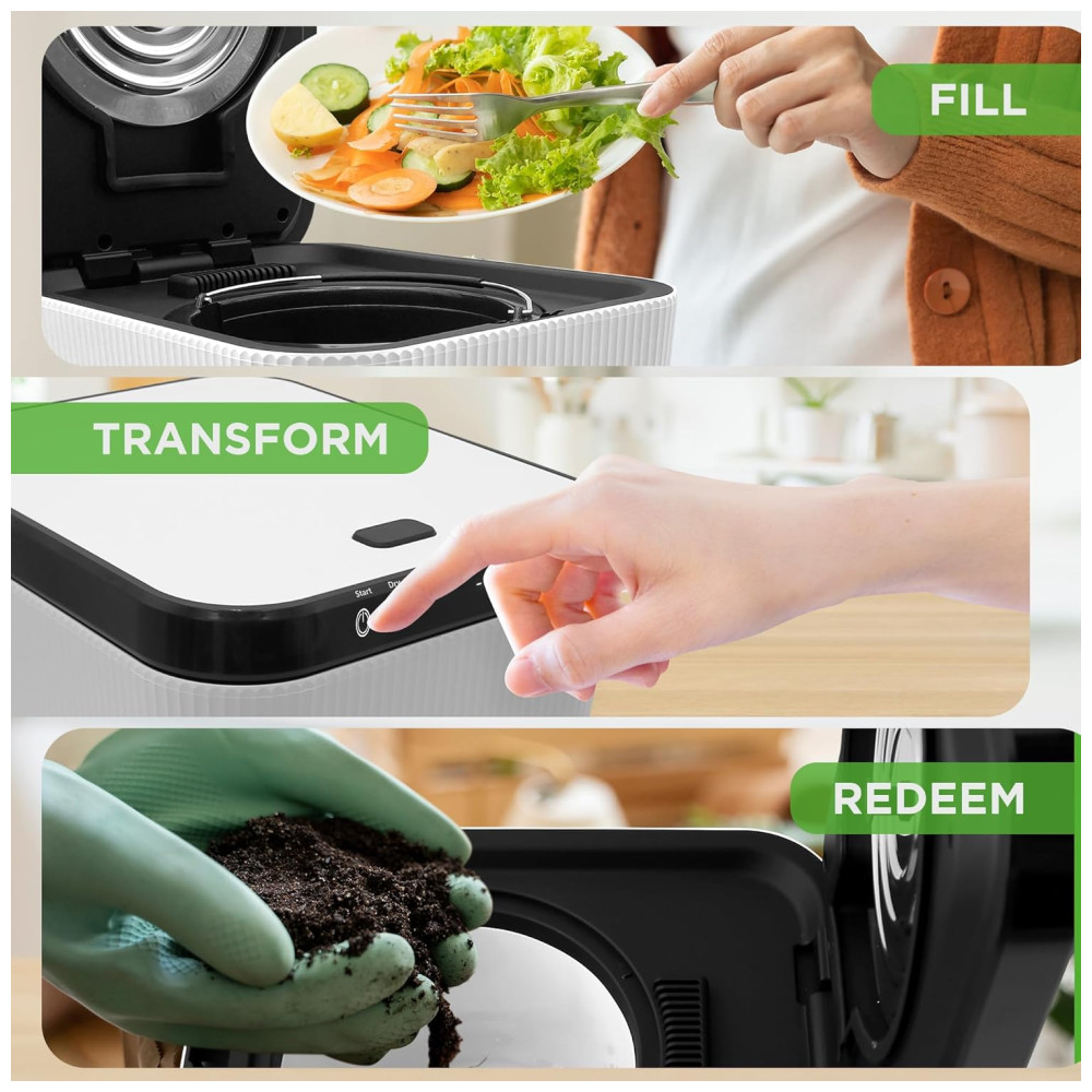 Apresentamos o Composter de Alimentos, uma solução moderna e eficiente para o gerenciamento de resíduos de cozinha. Com funções avançadas de secagem, trituração e resfriamento, este recipiente decompõe restos de frutas e vegetais, borra de café, cascas de ovos e outros resíduos alimentares em material de compostagem, tornando o descarte seguro e inofensivo.