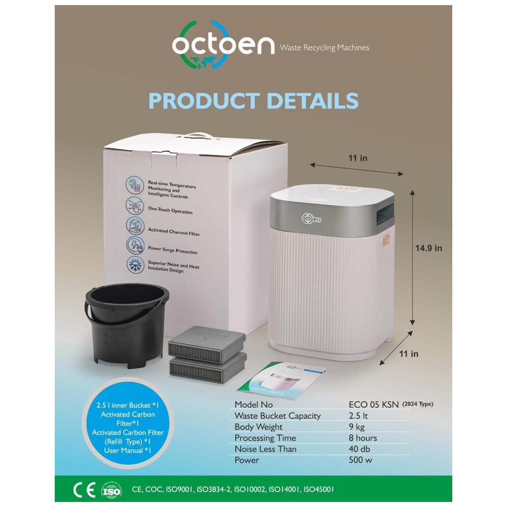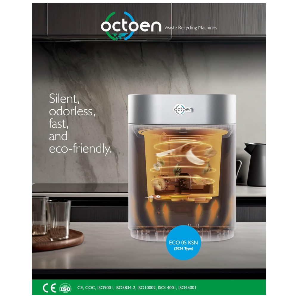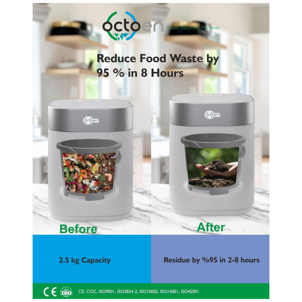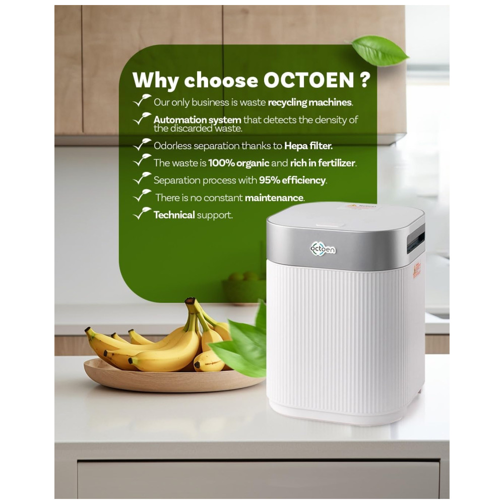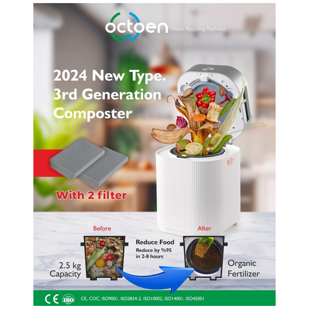 Este compostor é ideal para uso interno, operando silenciosamente e sem produzir odores desagradáveis. Equipado com um filtro de carvão, ele transforma restos de comida em composto sem o cheiro típico de lixo.