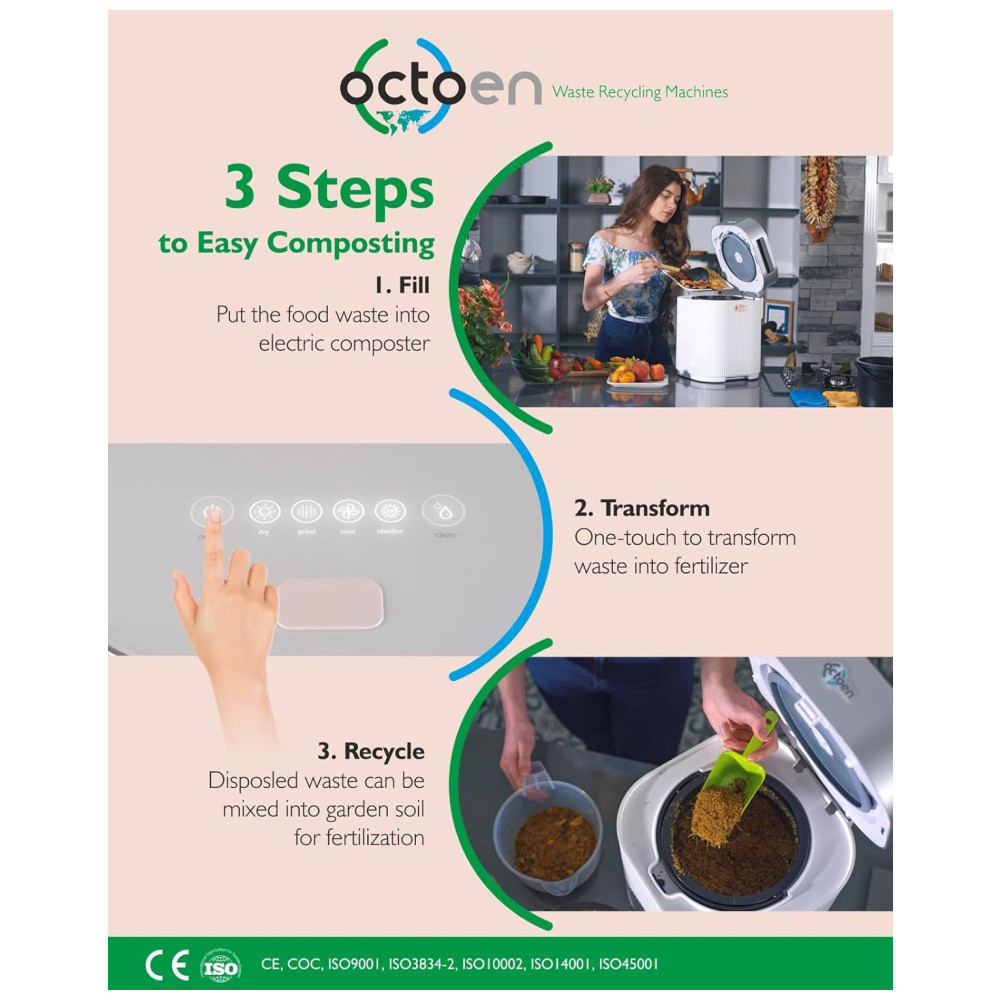 Seu tamanho compacto permite que ele se encaixe facilmente em qualquer espaço da cozinha, sem ocupar muito espaço. Além disso, é fácil de usar, mesmo para iniciantes: basta adicionar os restos de comida e a máquina se encarrega de transformá-los eficientemente em composto.