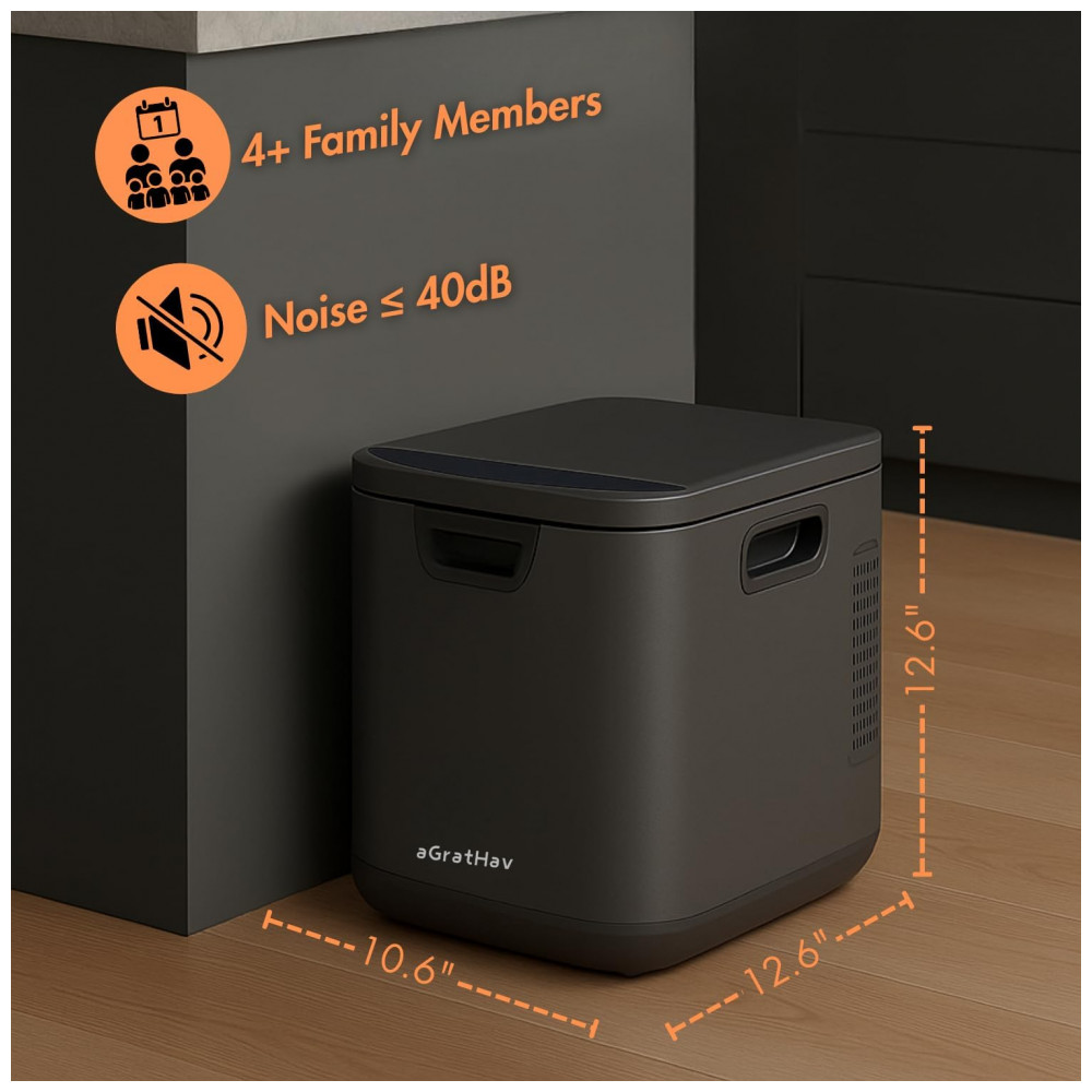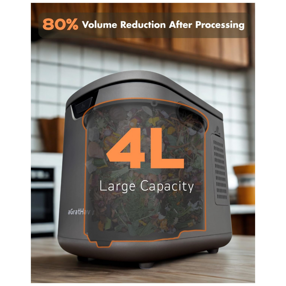 O compostor elétrico de cozinha aGratHav com 4L de capacidade processa resíduos alimentares via secagem em alta temperatura, trituração e resfriamento em 3 modos de processamento, com 3 opções de capacidade e funções de autolimpeza e auto-secagem. Projetado para bancada indoor, inclui 2 filtros de carbono para filtragem de odores durante ciclos que reduzem volume em até 90% em 3-6 horas. Adequado para famílias, suporta resíduos diários como cascas e sobras orgânicas.