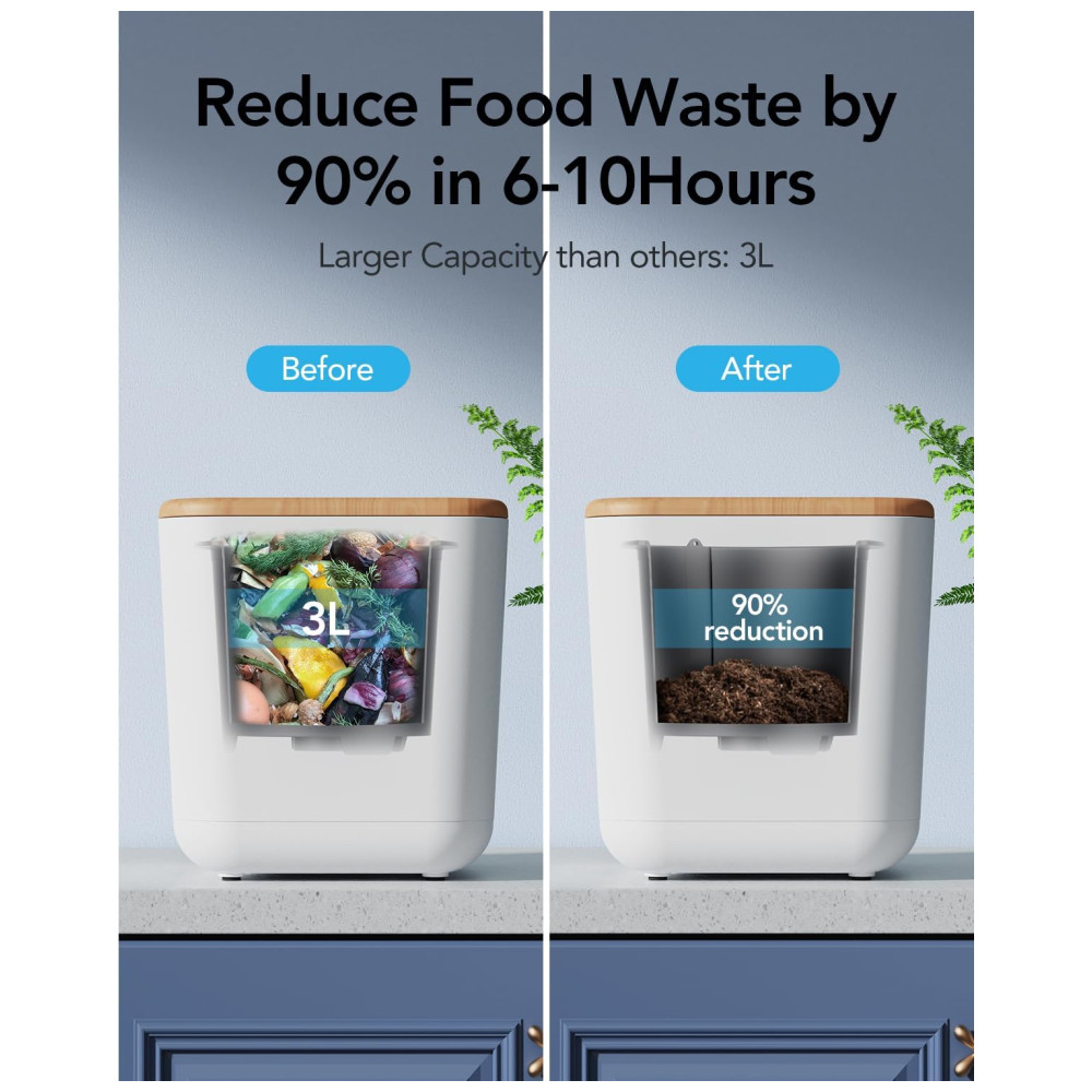 O design elegante e compacto do compostor, com dimensões de 28,5 cm x 35,1 cm x 33,7 cm, é perfeito para sua bancada, ocupando pouco espaço. Com capacidade de 3 litros, seu balde proporciona amplo espaço para os resíduos.