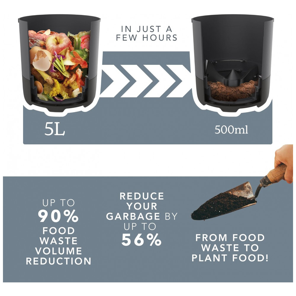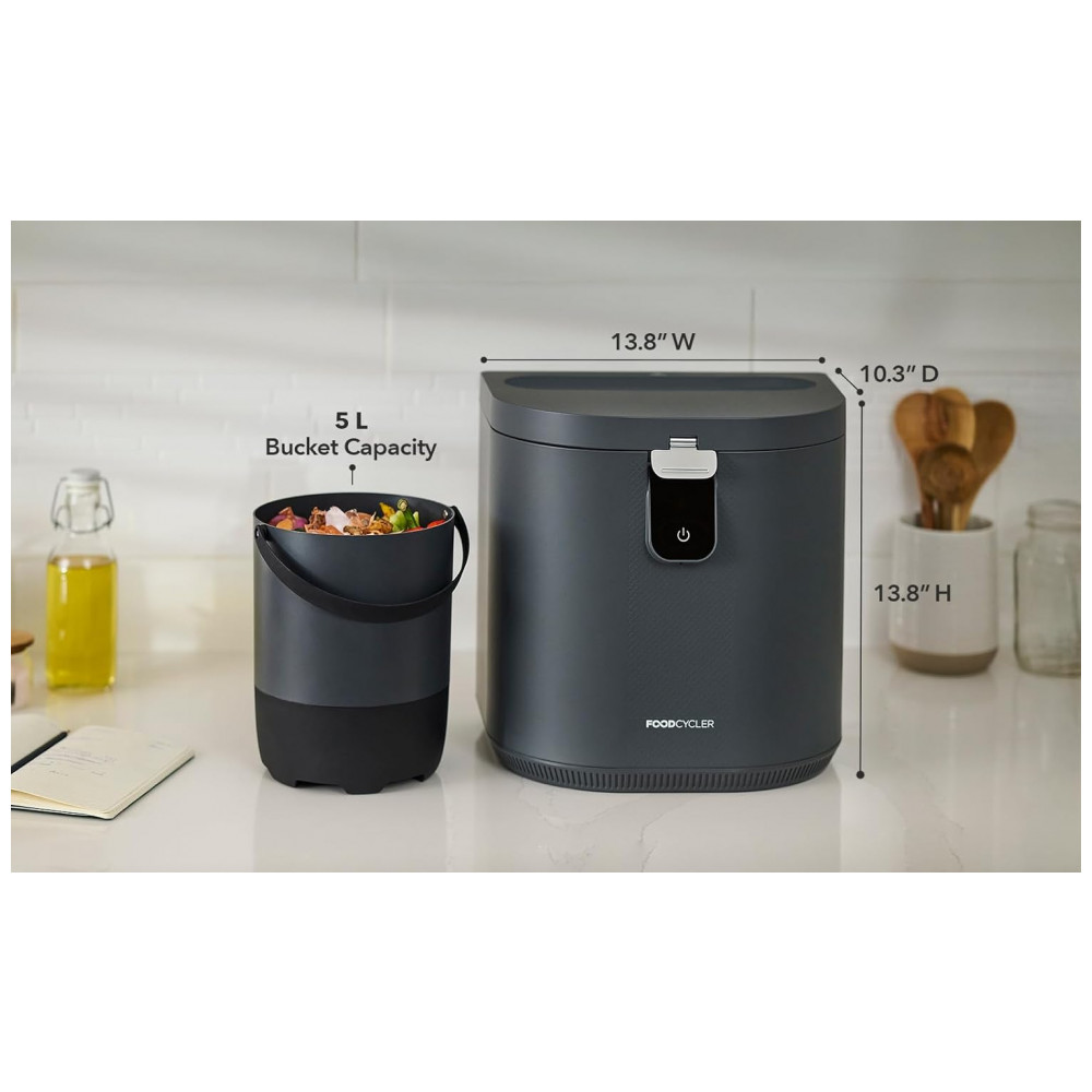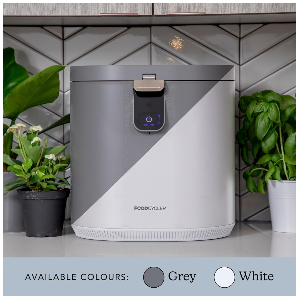 O Food Cycler Eco 5 é um reciclador elétrico de resíduos alimentares que processa lixo orgânico de cozinha em material seco por desidratação térmica acelerada e trituração, projetado para uso indoor em bancada residencial. Com capacidade de 5L, substitui compostores tradicionais em apartamentos ao reduzir volume de resíduos em ciclos rápidos de 3-8 horas, produzindo pré-composto utilizável como fertilizante. Inclui vedação contra odores e balde removível para fácil gestão de resíduos diários.