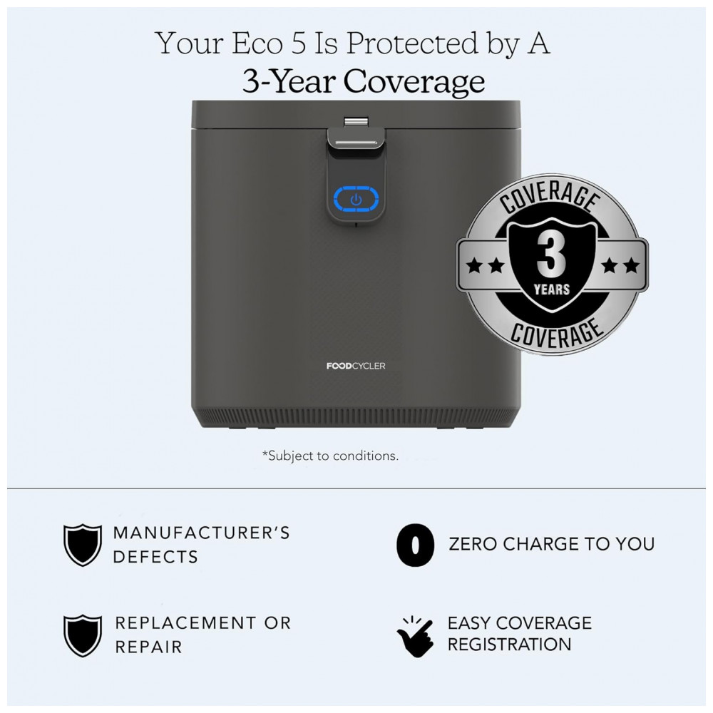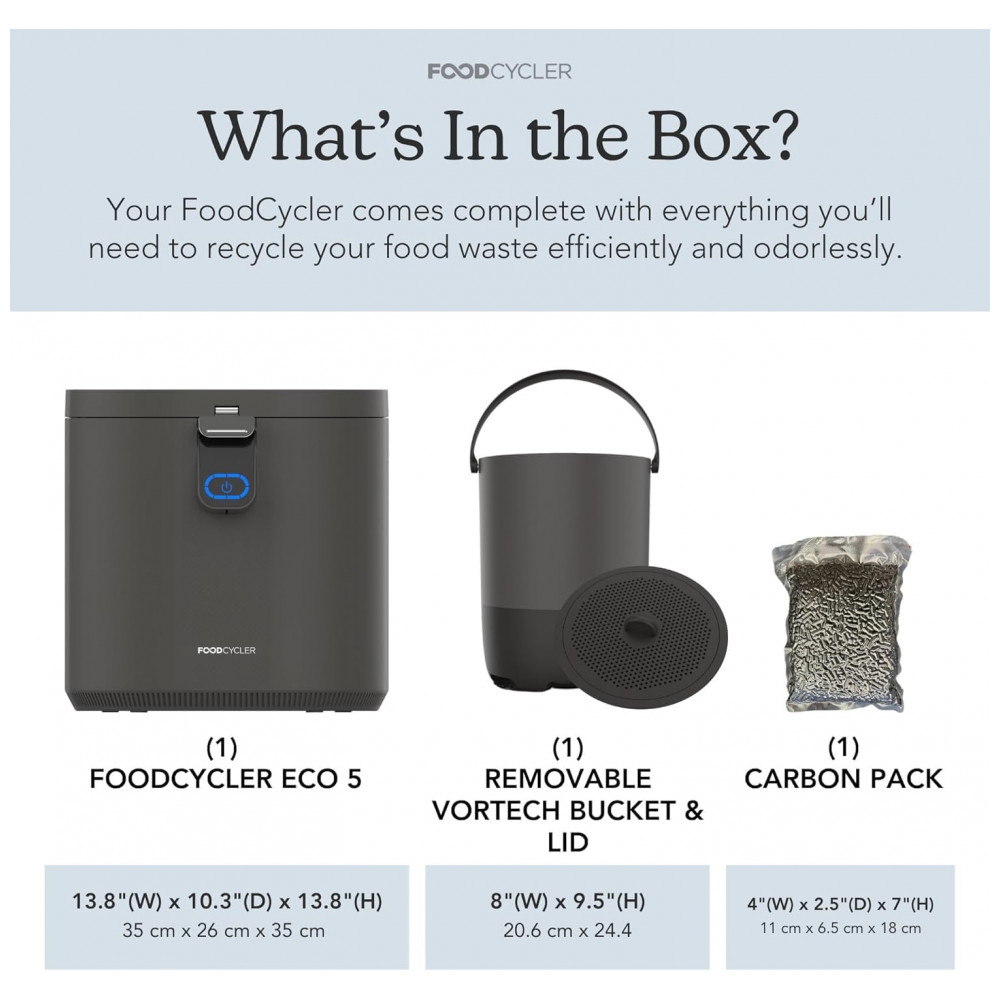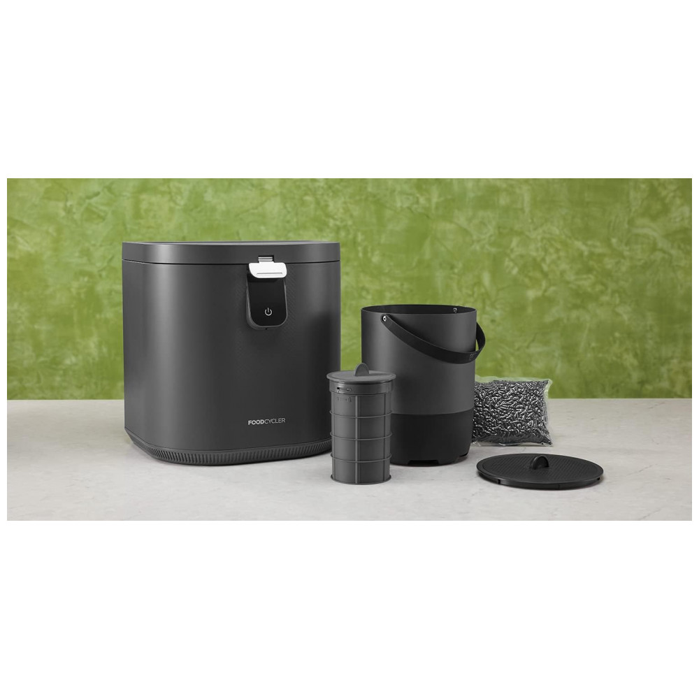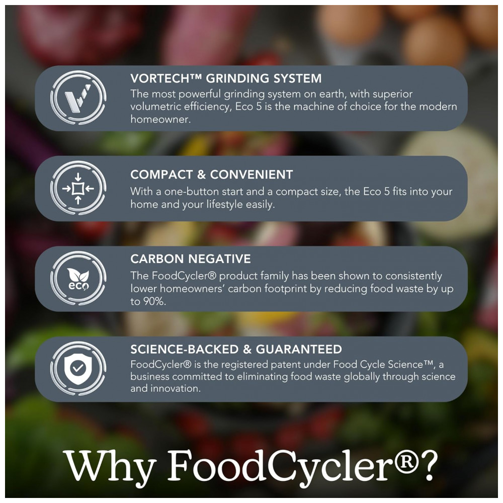 O Food Cycler Eco 5 é um reciclador elétrico de resíduos alimentares que processa lixo orgânico de cozinha em material seco por desidratação térmica acelerada e trituração, projetado para uso indoor em bancada residencial. Com capacidade de 5L, substitui compostores tradicionais em apartamentos ao reduzir volume de resíduos em ciclos rápidos de 3-8 horas, produzindo pré-composto utilizável como fertilizante. Inclui vedação contra odores e balde removível para fácil gestão de resíduos diários.