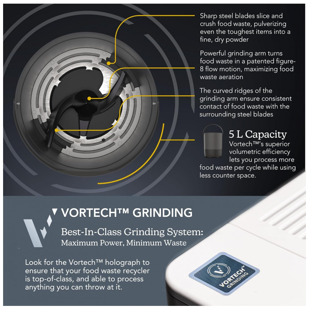Equipado com painel de controle simples e tecnologia de moagem fina, opera com baixo ruído e compatibilidade com sobras como cascas, vegetais cozidos e grãos. Materiais em plástico reforçado e aço inoxidável interno garantem higiene e resistência. Funciona em 120V/60Hz, padrão norte-americano, com consumo energético otimizado.