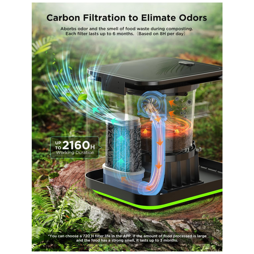 O compostor elétrico GoveeLife atualizado processa resíduos alimentares em fertilizante seco por desidratação térmica, trituração e ciclos automatizados, projetado para uso indoor em bancada de cozinha residencial. Inclui display LED para monitoramento de status, sistema de autolimpeza e operação silenciosa com filtro de carbono contra odores, suportando até 600g por ciclo em apartamentos ou casas compactas.
