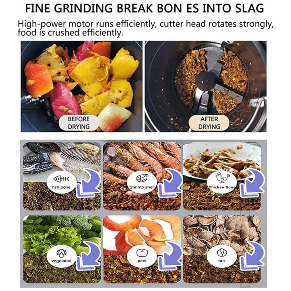 Sistema inclui sensor de enchimento e lâminas rotativas para quebra eficiente de materiais fibrosos. Estrutura em plástico ABS com balde interno removível facilita esvaziamento e higiene. Opera em voltagem 120V/60Hz, compatível com redes norte-americanas via adaptador no Brasil.