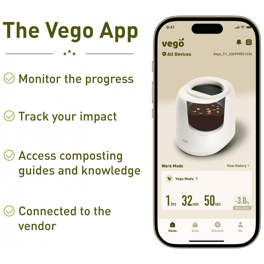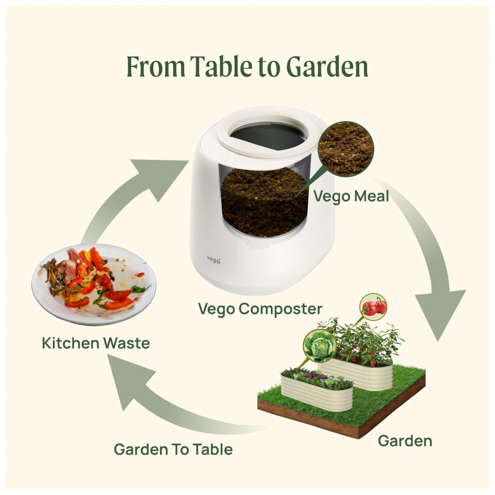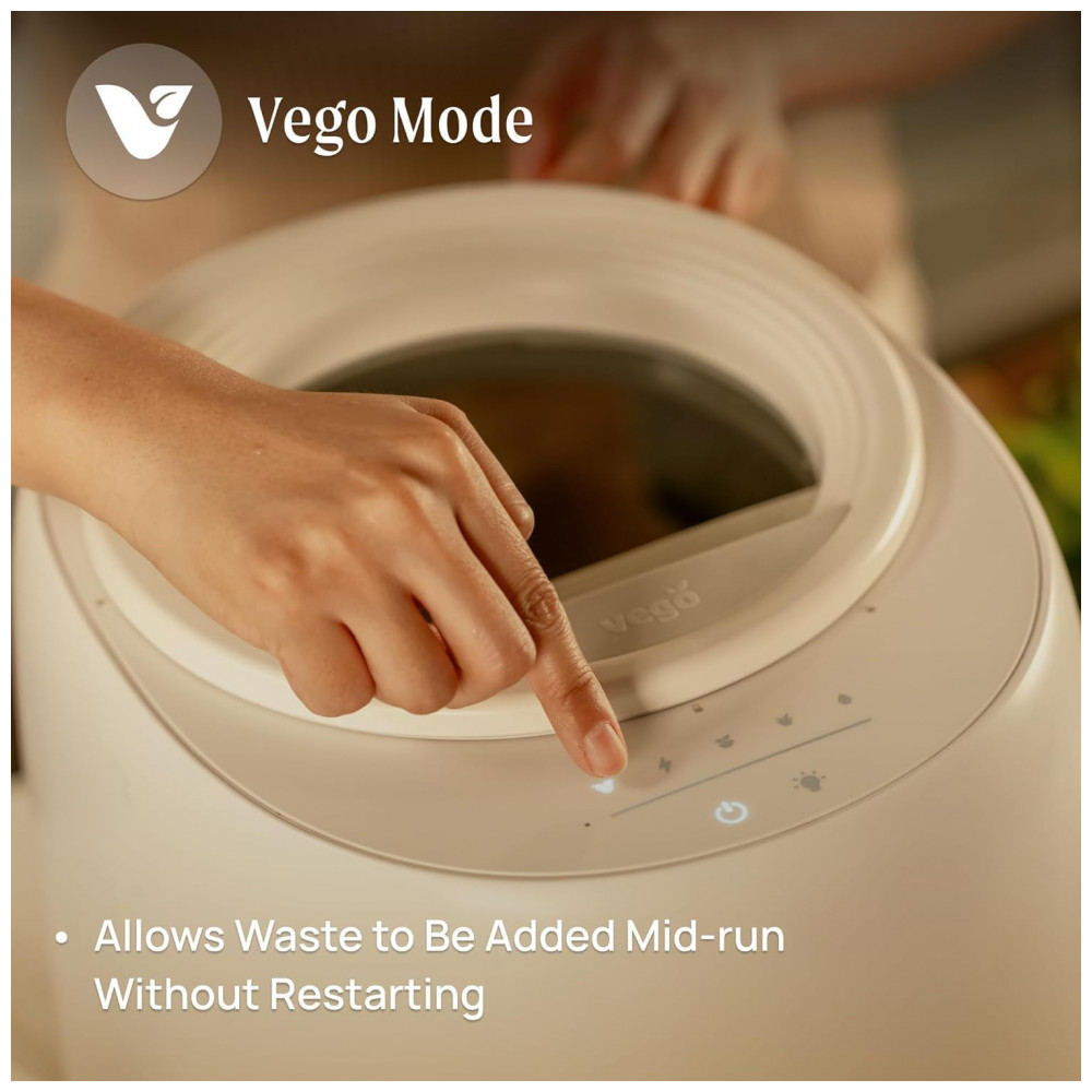 O compostor elétrico Vego Kitchen de 4L processa resíduos alimentares em composto seco via 5 modos baseados em peso, com controle por aplicativo móvel e sistema de autolimpeza para uso indoor em bancada. Possui vedação hermética contra odores e sensor integrado para otimizar ciclos de desidratação e trituração, suportando até 1 kg por operação em cozinhas residenciais. Compatível com Wi-Fi para monitoramento remoto.