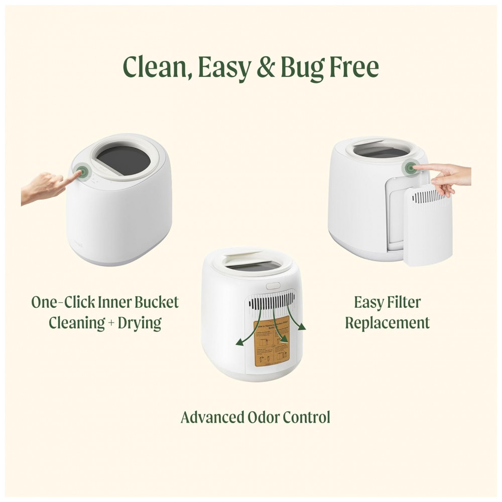 Cuidados: Esvaziar bandeja semanalmente, substituir filtros HEPA/carbono trimestralmente e limpar com água morna após ciclos automáticos. Evite metais ou plásticos nos resíduos.
