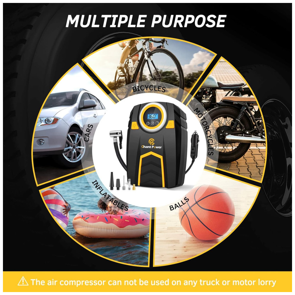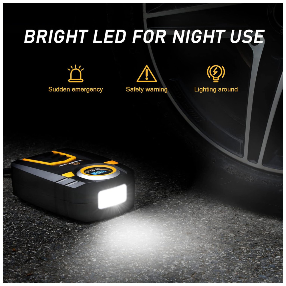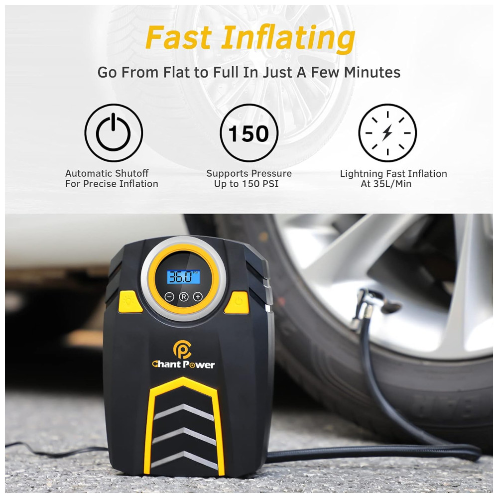 Motor forte e inflação rápida Este compressor de ar portátil para o pneu do seu carro é capaz de fornecer uma pressão máxima de 150 psi e um fluxo de ar de 35L , Min. Você pode encher o pneu de um carro de 0 a 35 psi em apenas quatro minutos.