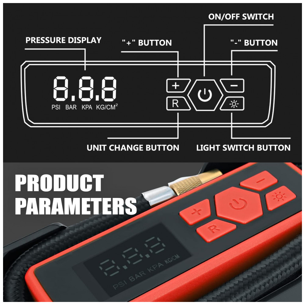 DESIGN PORTÁTIL Este pequeno inflador de pneus é conveniente de usar e economiza espaço, pode ser colocado no carro e a qualquer momento. O cabo de alimentação de 2,80M é zenado dentro da pequena unidade compacta, tornando o o acessório perfeito para automóveis.