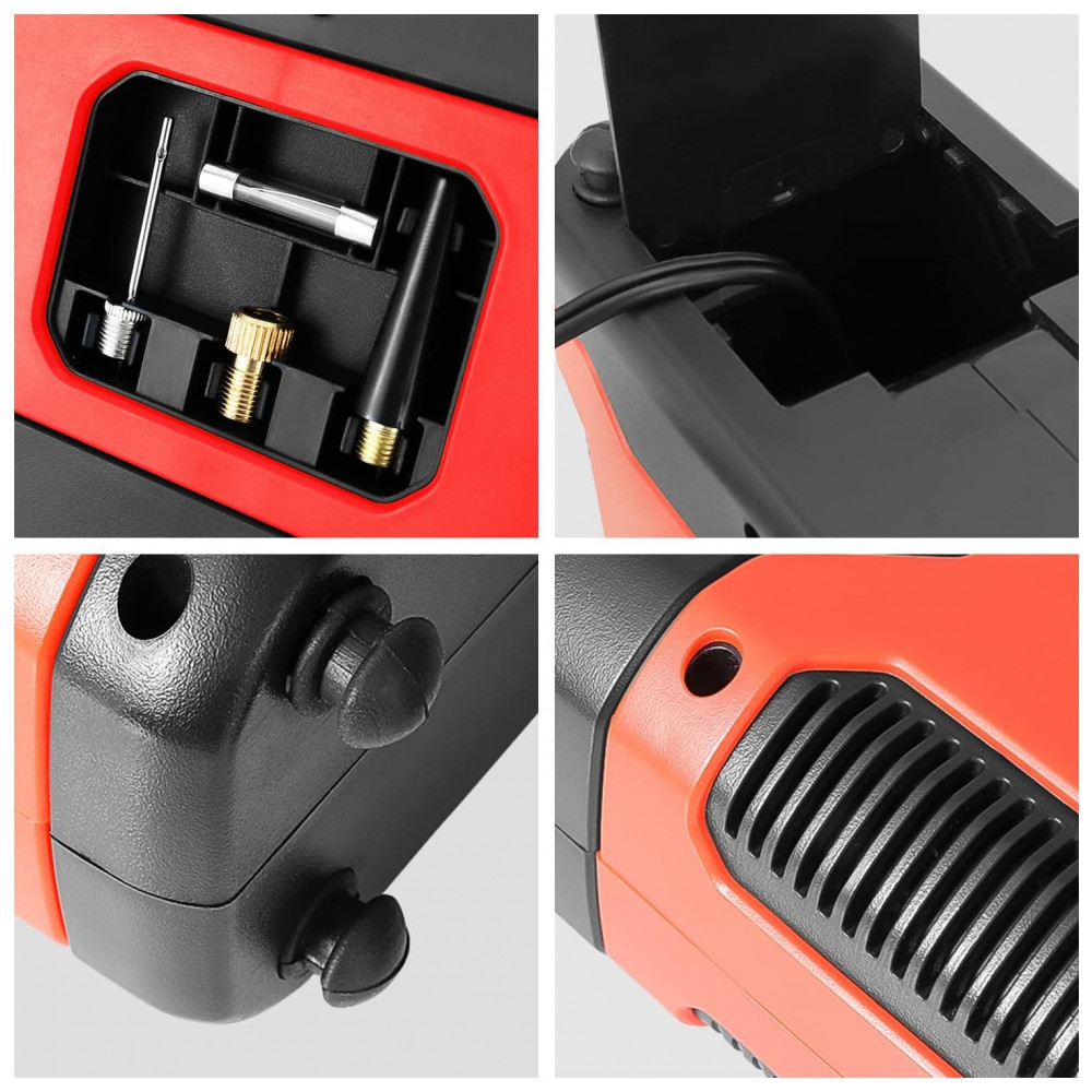 USOS MÚLTIPLOS Este compressor de ar automotivo também oferece 4 bicos adicionais para várias aplicações. Serve para veículos, bicicletas, motocicletas, anéis de natação, barcos de borracha, bolas e outros infláveis.