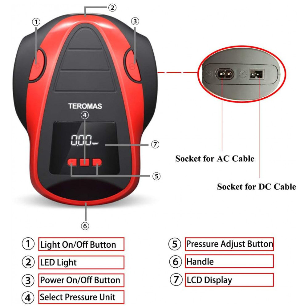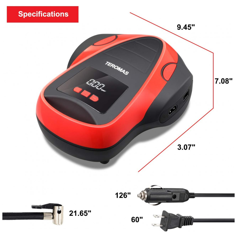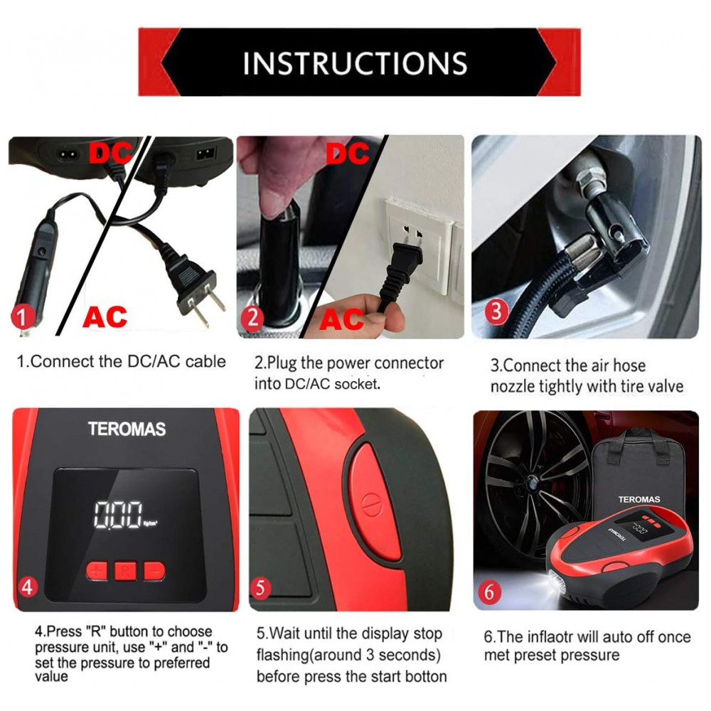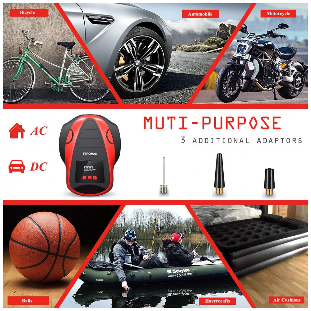 AC, DC OUTLET MULTI PURPOSE O inflador de pneus TEROMAS exclusivo AC, DC com plugue de luz de cigarro de carro de 12V, bem como plugue de parede de 110, 120V para tomada doméstica torna este inflador mais útil, pois você pode usá lo em qualquer lugar. Vem com 3 adaptadores adicionais que o tornam perfeito para carros, trailers, motocicletas, pneus de bicicletas, colchão de ar, barcos infláveis, bolas e outros infláveis.