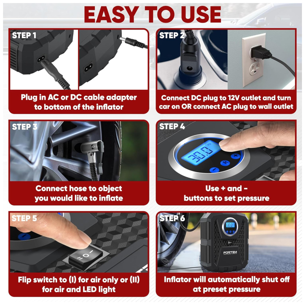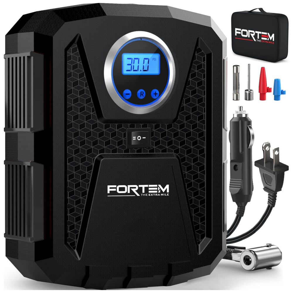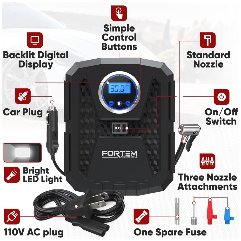 Compressor de Ar com Fio Portátil 150 PSI Recarregável com Tela LED e Desligamento Automático 110V FORTEM Preto