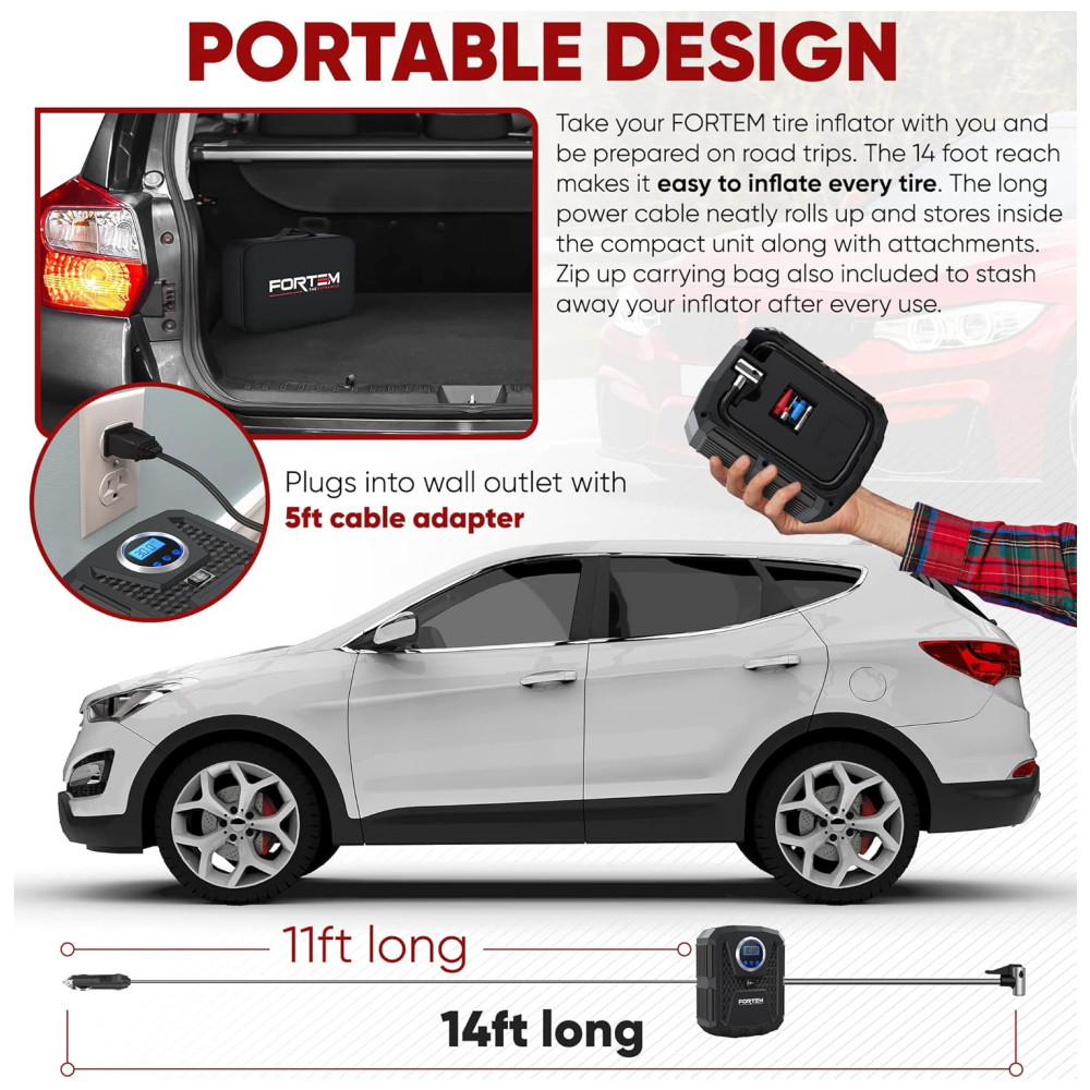 Portátil e Compacto Leve seu compressor de ar Fortem para carro com você e esteja pronto para qualquer emergência. Os cabos de alcance de 4m são zenados dentro da pequena unidade compacta, tornando os compressores de ar o acessório perfeito para automóveis.