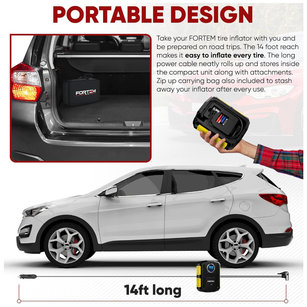 Portátil e Compacto Leve seu compressor de ar Fortem para carro com você e esteja pronto para qualquer emergência. Os cabos de alcance de 4m são zenados dentro da pequena unidade compacta, tornando os compressores de ar o acessório perfeito para automóveis.