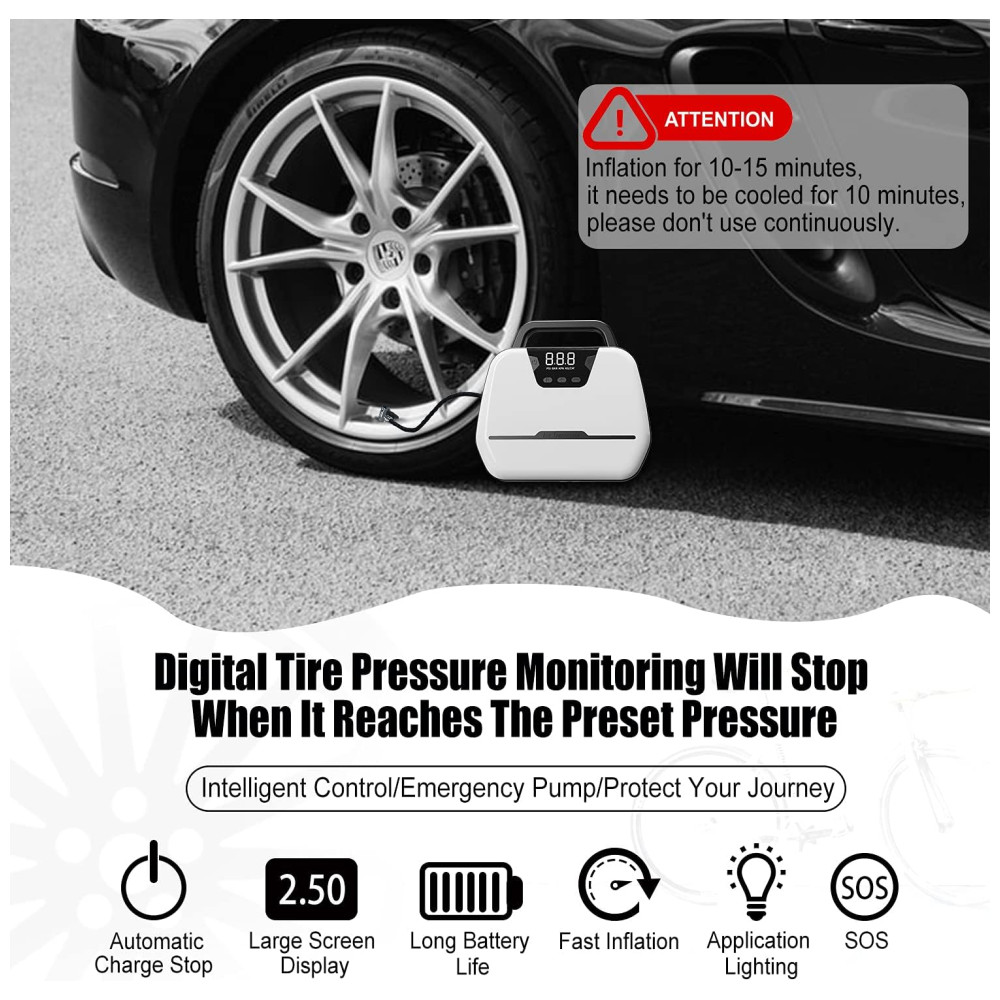 POUCO COMPRESSOR DE AR E FORTE POTÊNCIA Bomba de ar automática pode inflar até 150 PSI, inflar o pneu de carro de tamanho médio em cerca de 3 5 minutos. Isso torna o enchimento dos pneus em emergências mais fácil e rápido. O tamanho portátil ocupa muito pouco espaço e permite mantê lo em sua casa ou automóvel, é um ótimo parceiro para suas longas viagens.
