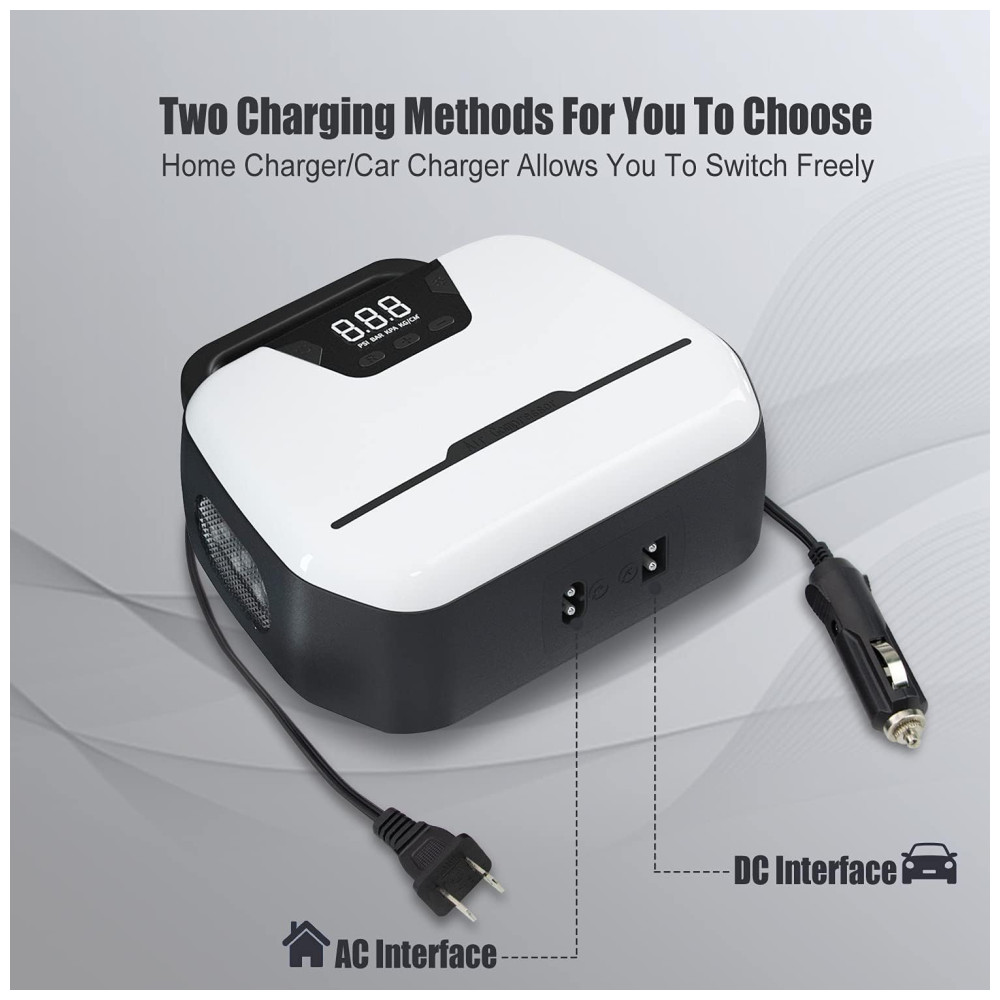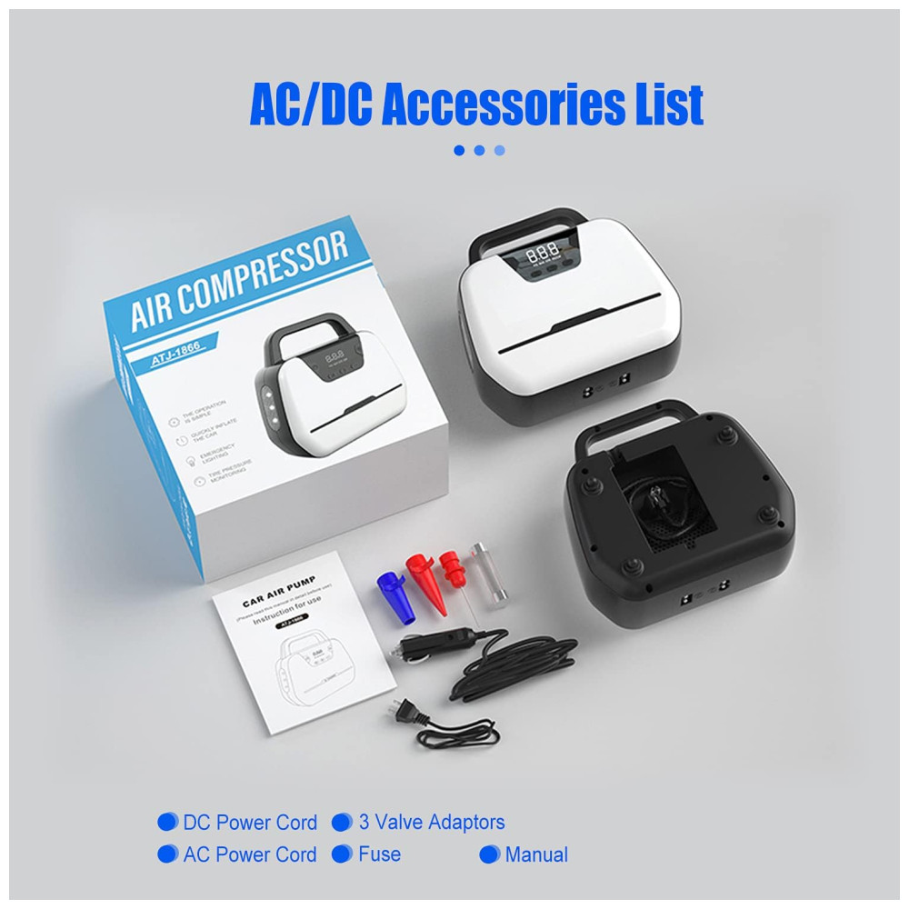 ENTRADA AC , DC E MULTIFUNCIONAL Inflador portátil de pneus AC , DC exclusivo com plugue de acendedor de cigarros de 12 V e tomada de parede de 110 V para tomada doméstica torna este inflador mais conveniente, pois você pode usá lo em qualquer lugar. Este pacote vem com 4 adaptadores adicionais que são multifuncionais e perfeitos para carros, SUVs, motocicletas, pneus de bicicleta, colchões de ar, bolas, barcos infláveis e outros infláveis.