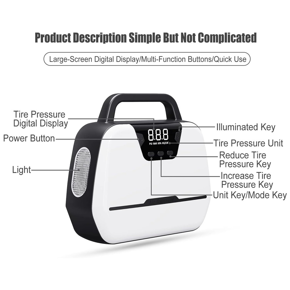 DISPLAY DIGITAL E ILUMINAÇÃO DE EMERGÊNCIA POR LED A bomba de ar para pneus possui iluminação de emergência por LED e um manômetro preciso para uso em situações de emergência, a melhor escolha para encher o pneu à noite na estrada. Nossa bomba elétrica para pneus também é compacta e leve