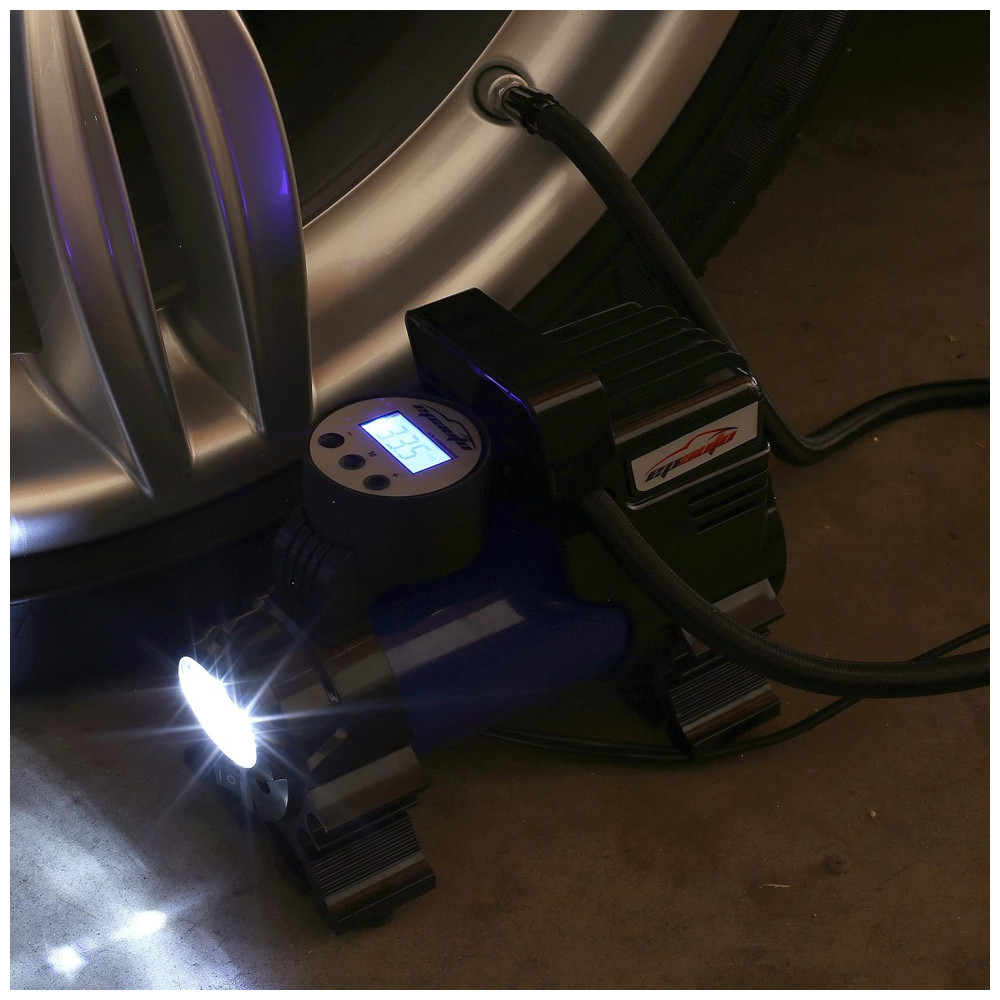 Vários usos Encha pneus em carros, bicicletas, sedan e SUV de médio porte. Tamanho do motor abaixo de 3,5 litros. O conector de válvula universal para válvula Schrader está pronto para uso. Adaptadores adicionais incluem valor de agulhas para basquete, bolas, adaptadores de cone curto e cone longo para caiaque inflável, acessórios de piscina, etc