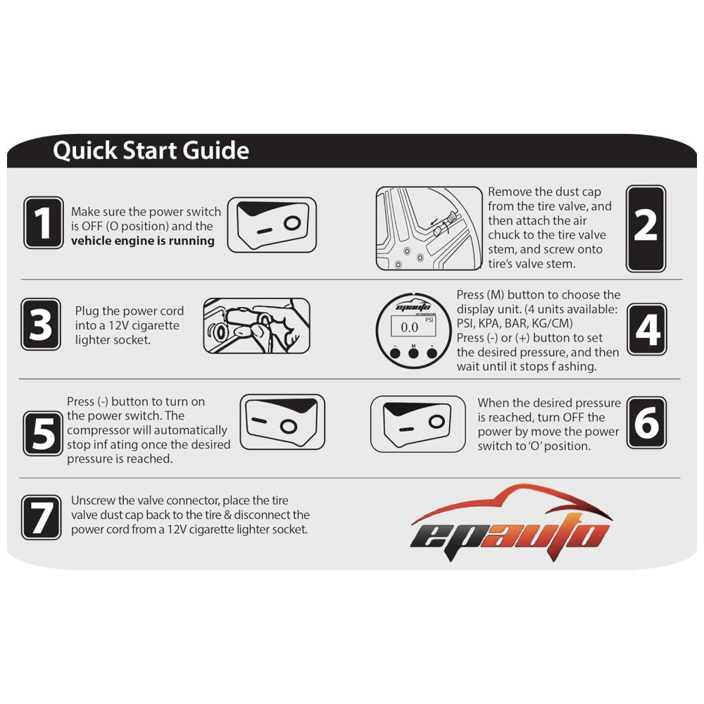 Impedir o excesso de inflação Desligue automaticamente ao atingir a pressão do pneu desejada. A proteção contra superaquecimento desliga automaticamente durante a sobrecarga. Patente USPTO NO D875.788