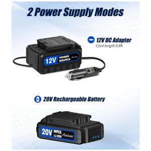 Fonte de alimentação dupla Fonte de alimentação de íon de lítio recarregável de 20V e fonte de alimentação de 12V DC torna a inflação mais fácil. Você não precisa se preocupar em ficar sem bateria durante a viagem com a fonte de alimentação alternativa do adaptador de 12V DC. Uma ótima solução para emergências no caminho.