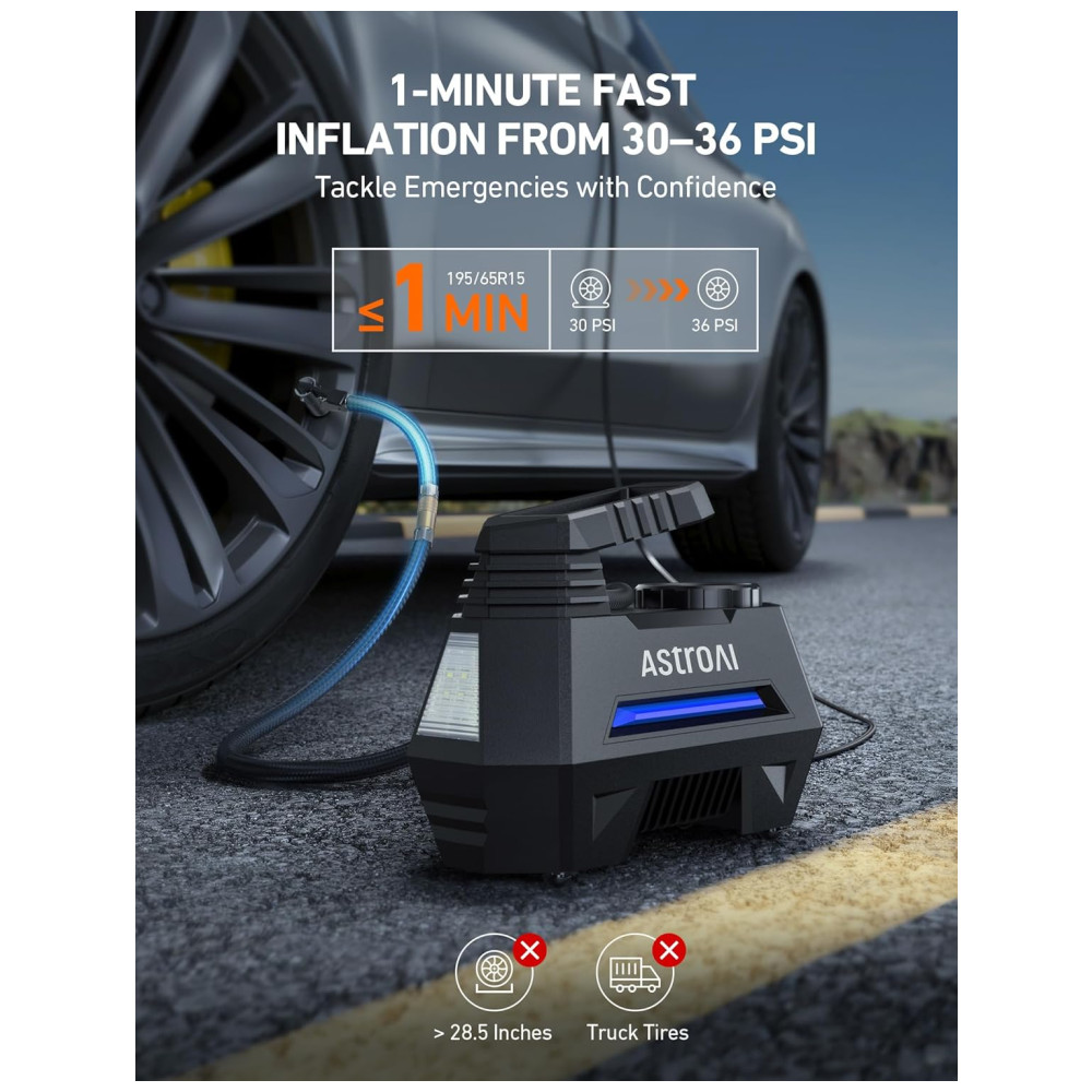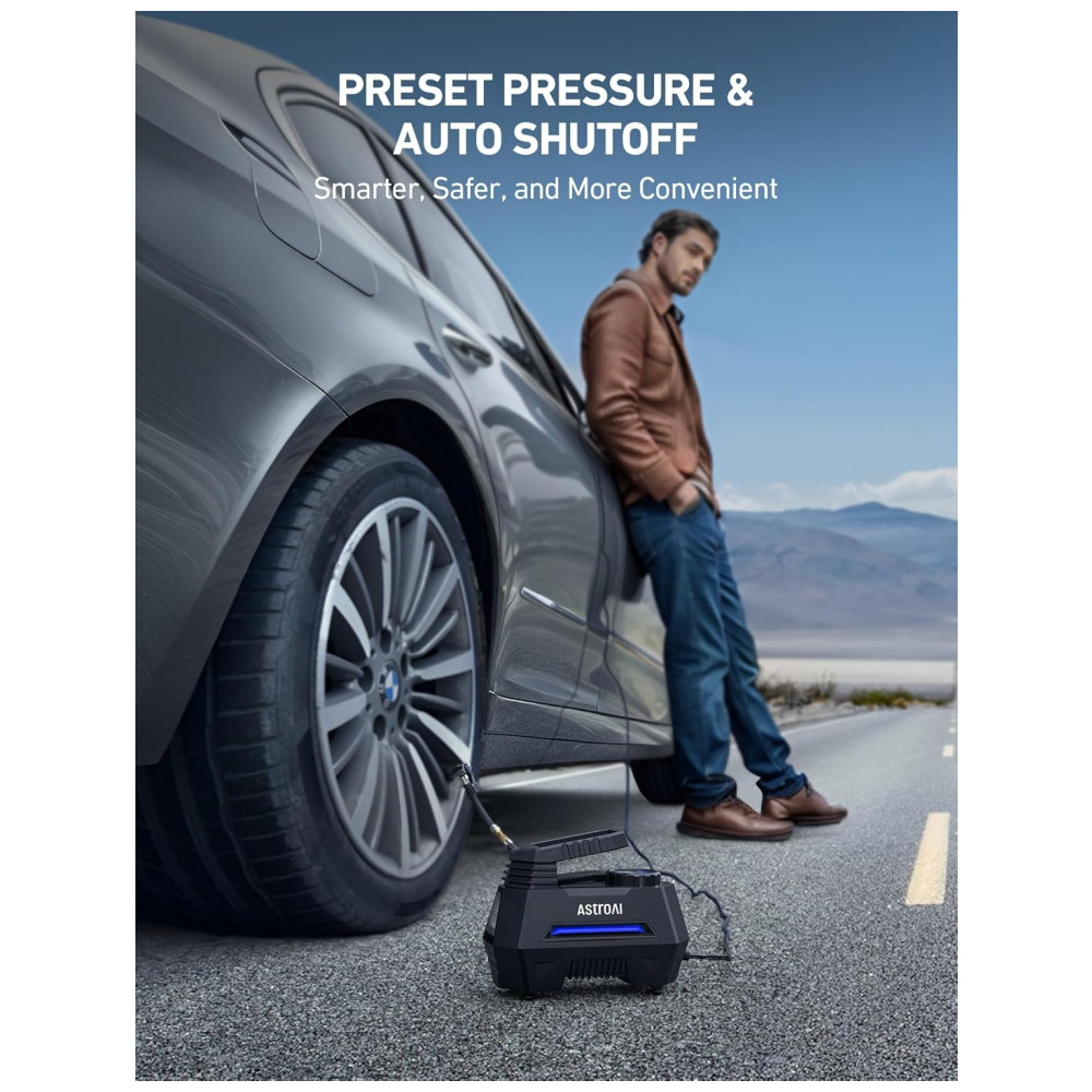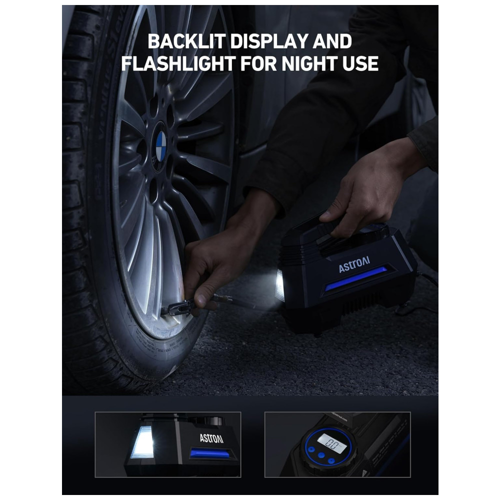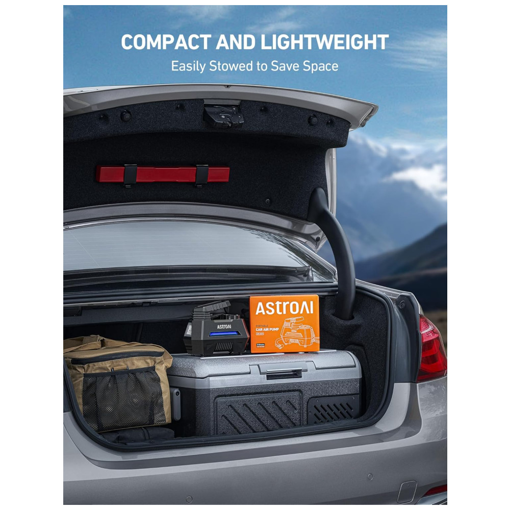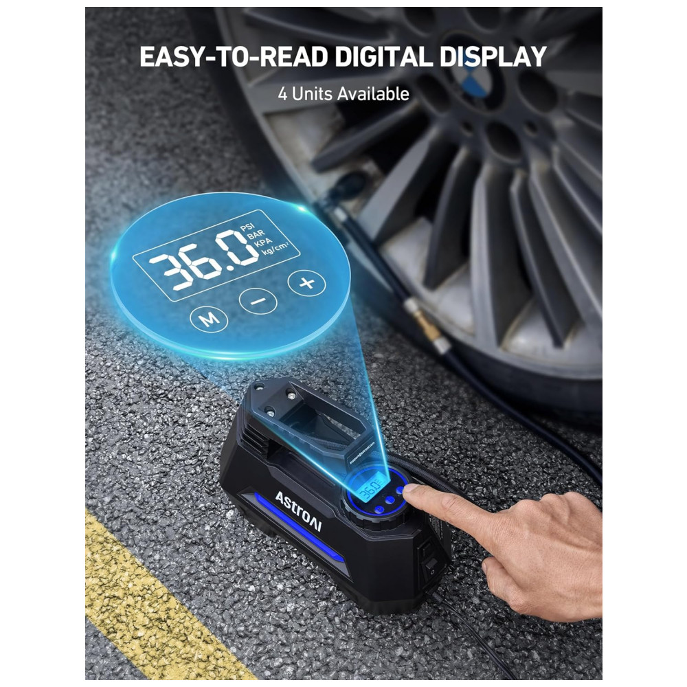 Compressor de Ar Portátil 100 PSI Recarregável com Tela LED e Manômetro Digital 12V 120W AstroAI A220BL Preto e Azul