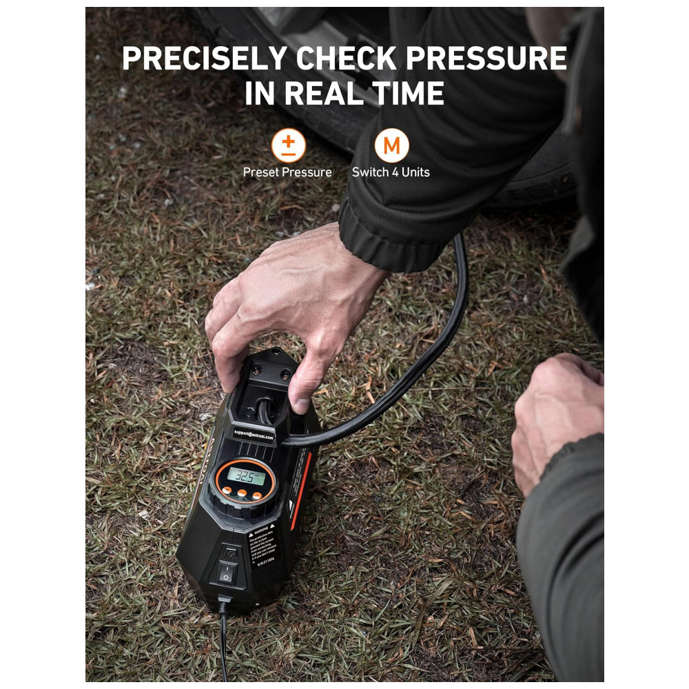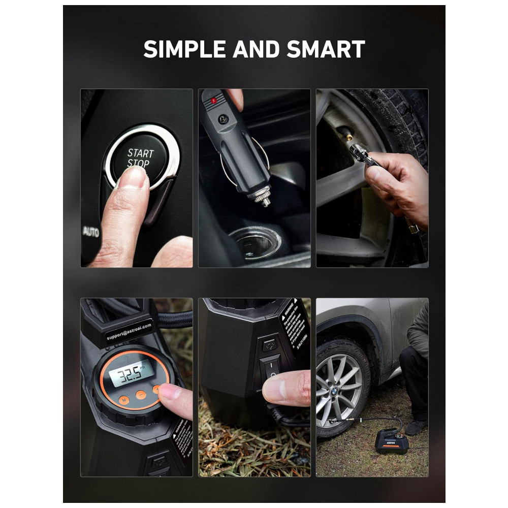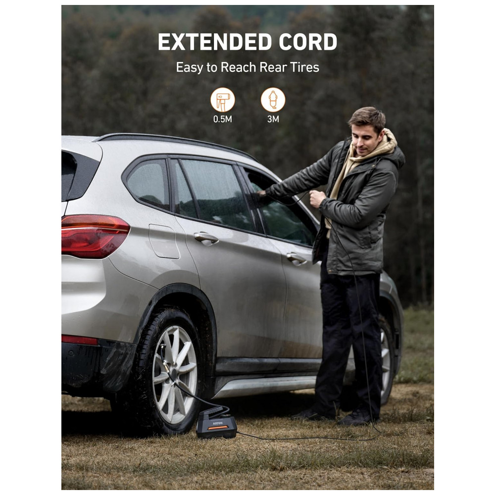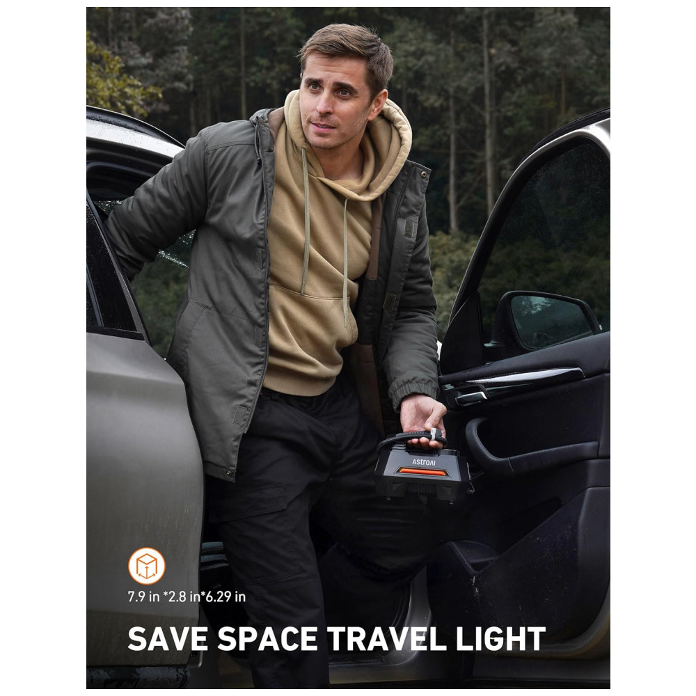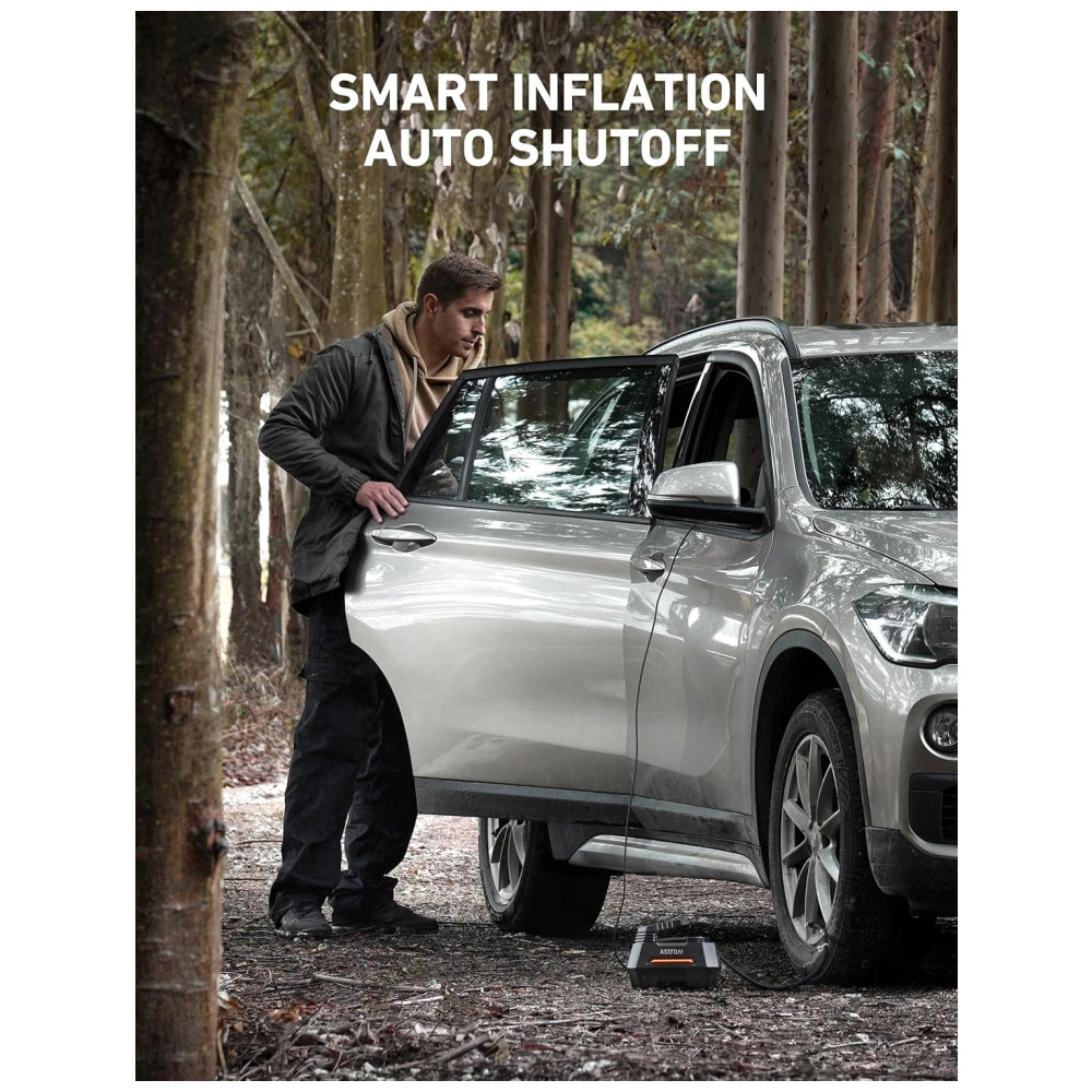 Compressor de Ar Portátil 100 PSI Recarregável com Tela LED e Manômetro Digital 12V 120W AstroAI AC220O Preto e Laranja