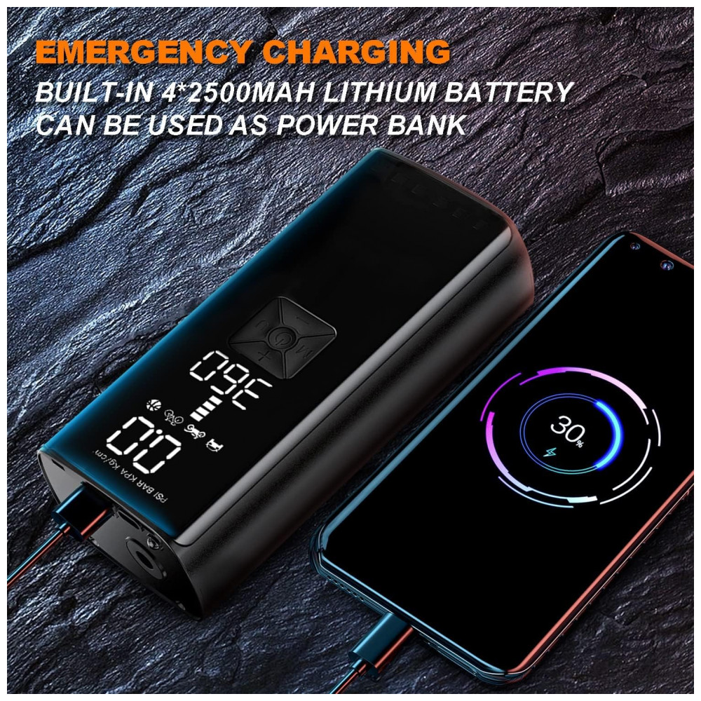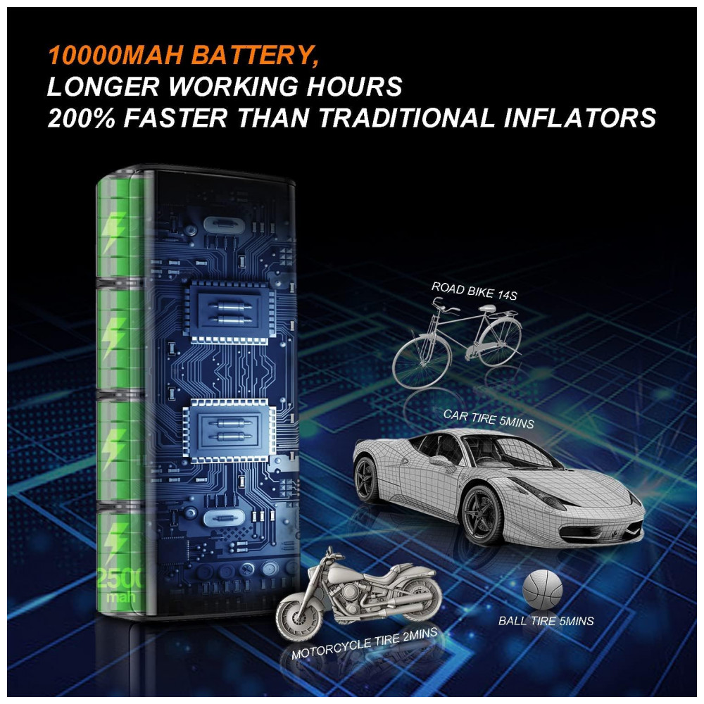 Bateria poderosa de 10000mAhVem com a bateria recarregável de 4 2500mAh, o inflador de pneus de carro portátil pode funcionar sem uma fonte de alimentação e fornecer um tempo de execução contínuo sem fio de até 80 minutos.