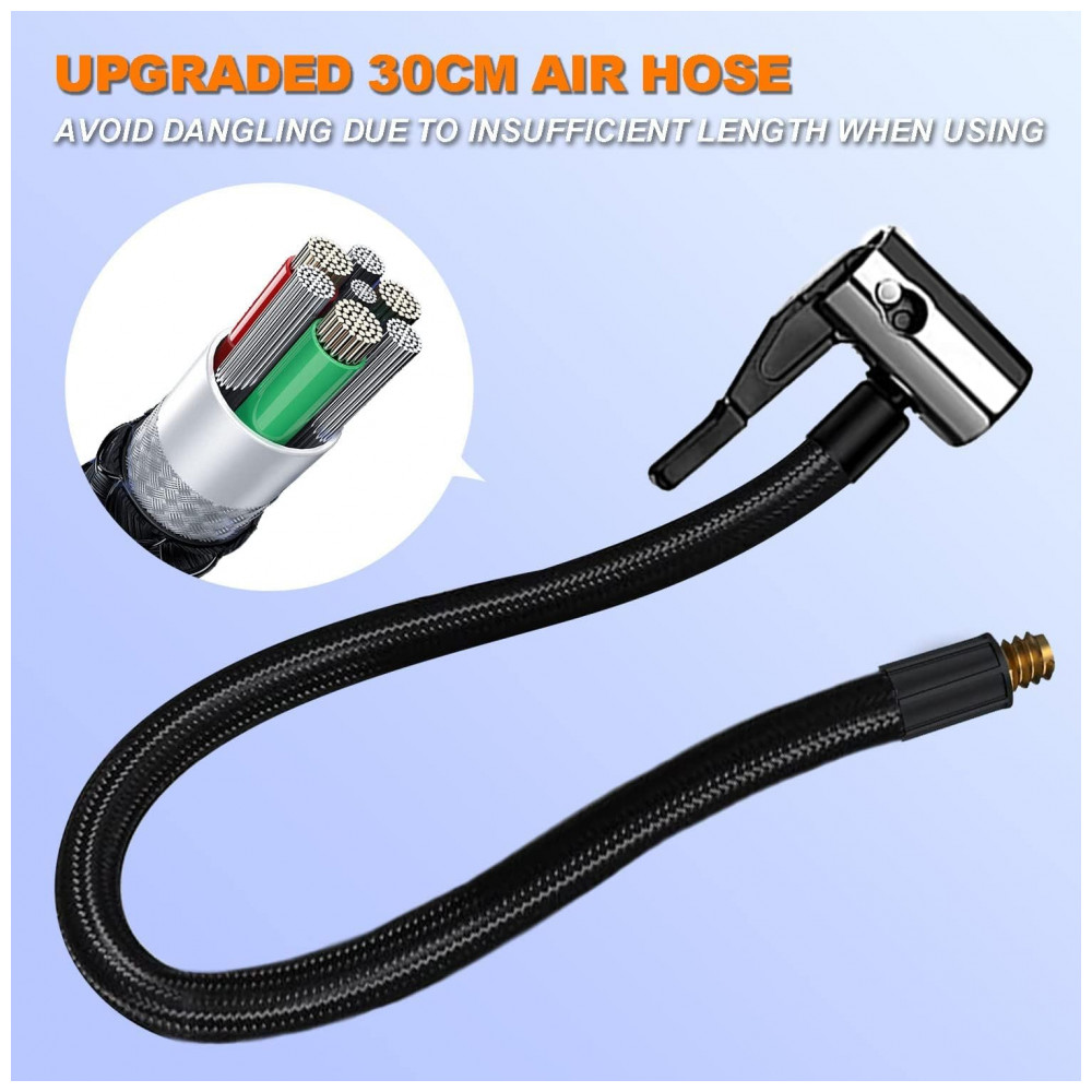Mangueira de ar estendidaPara facilitar o uso, aumentamos a mangueira para 12 polegadas em vez da tradicional mangueira de ar de 8 polegadas. A mangueira de ar de nylon trançado duplo é mais durável e proporciona uma vida útil mais longa.