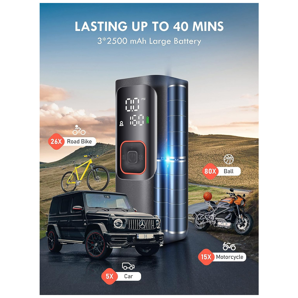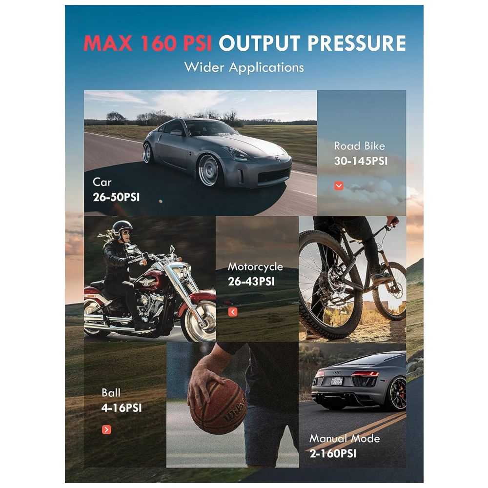 5 modos de inflação e pressão máxima de 160PSI, adequados para várias situações de inflaçãoa bomba de ar elétrica tem 5 modos de inflação predefinidos carros, motocicletas, bicicletas, bolas, manual que podem ser trocados de forma simples e fácil dependendo de suas necessidades de inflação. A pressão máxima do modo manual é de até 160 PSI, fornece uma condição inflável mais ampla para você