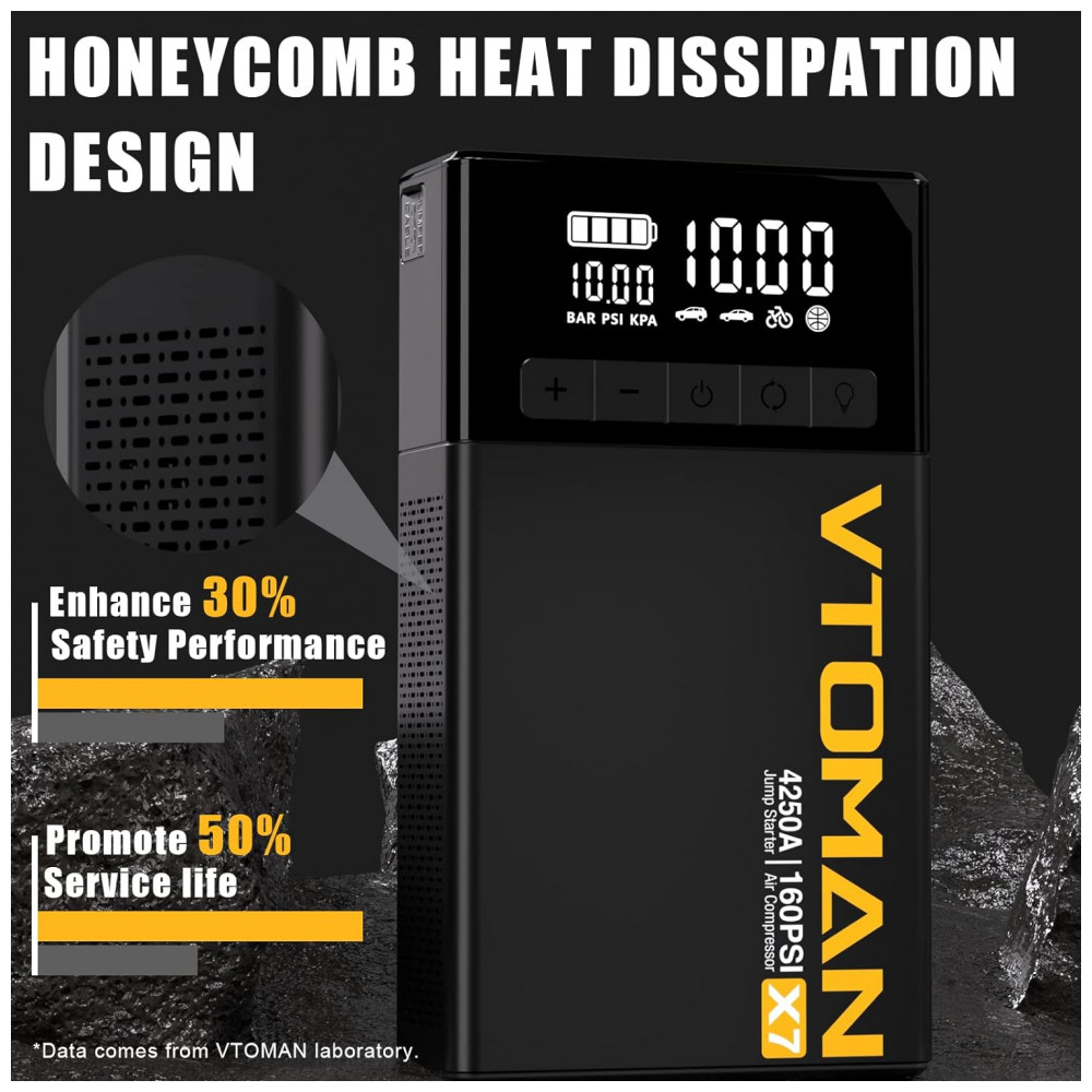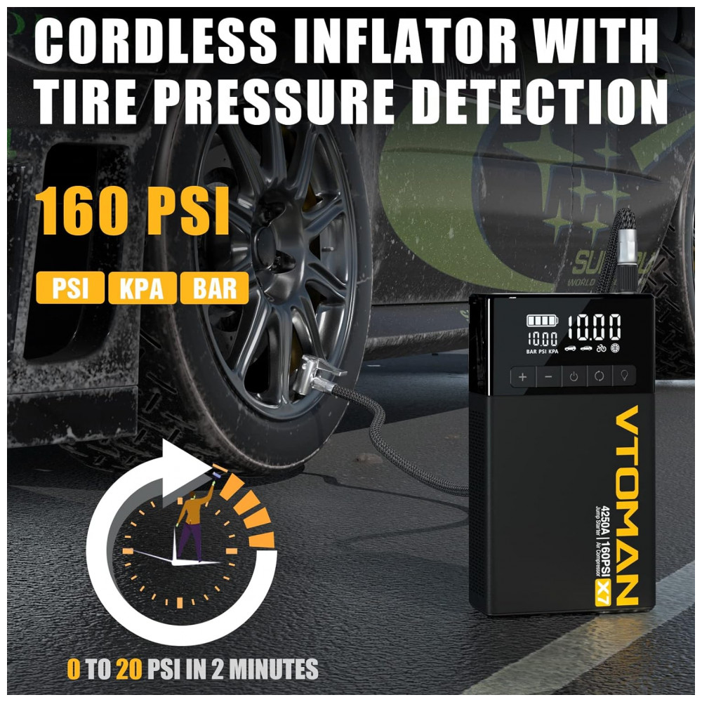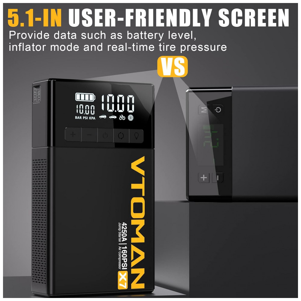 Compressor de Ar Portátil 160 PSI Recarregável com Display Inteligente e Acionador de Partida 12V VTOMAN X7 Preto
