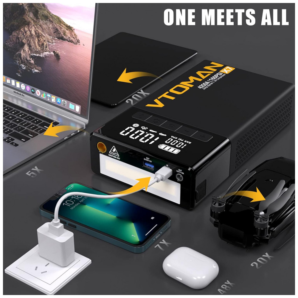 MAIS DO QUE UM JUMP STARTER X7 não é apenas caixa de salto, banco de potência, inflador de pneus, lanterna LED, mas também suporta carregamento rápido tipo c de 18W. O pacote de salto X7 leva apenas dez minutos para carregar para encher completamente um pneu. Além disso, a luz LED de 400 lúmens equipada com o iniciador de bateria X7 suporta quatro modos de iluminação iluminação constante branca, iluminação constante vermelha, flash e SOS.